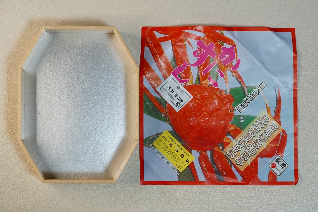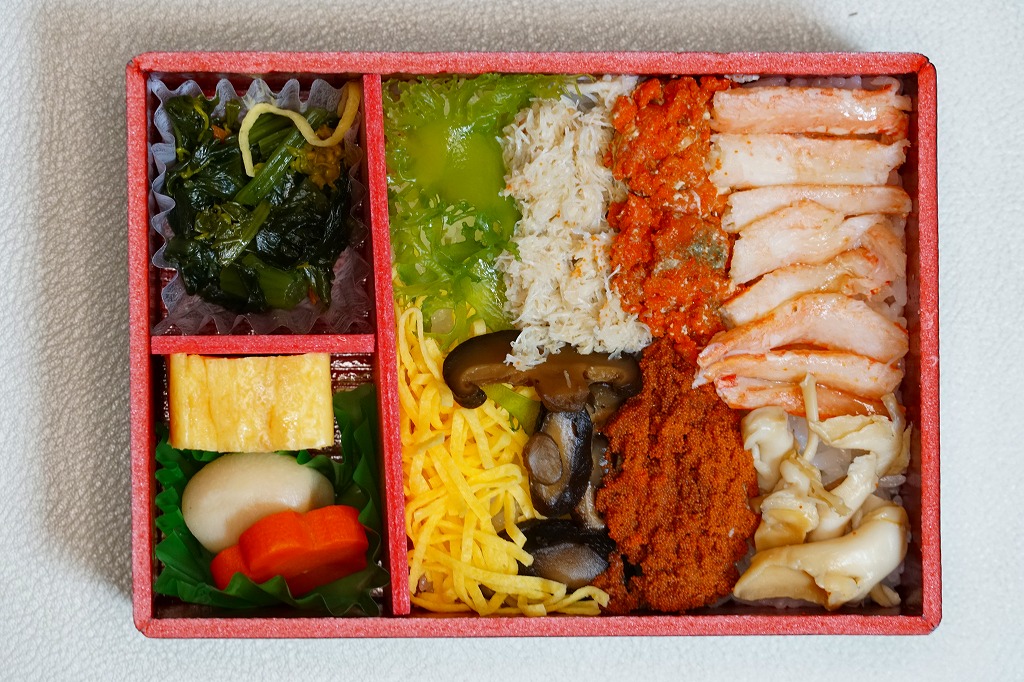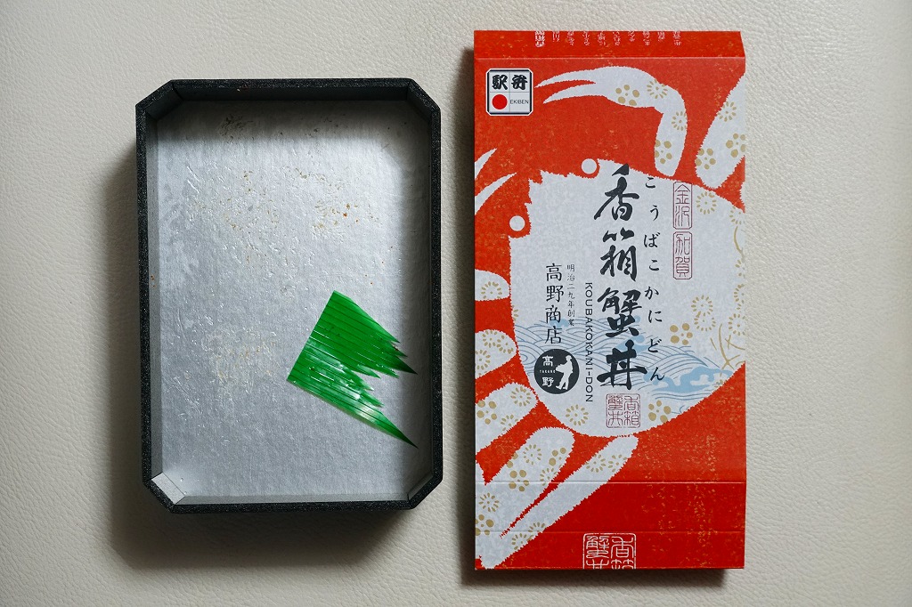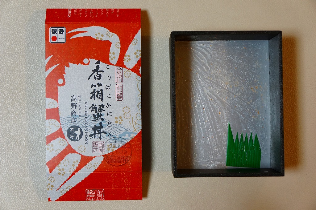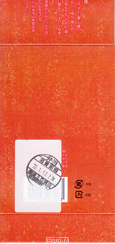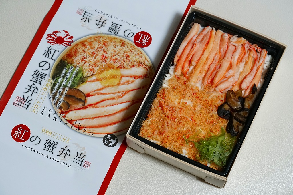 2023(令和5)年1月の京王百貨店の駅弁大会で実演販売。小柄で四角い容器に飯を詰め、蟹の脚肉、腹肉、ほぐし、内子を「ふんだんに」載せ、バイ貝と椎茸と海藻と錦糸卵で補い、玉子焼と煮物と青菜を添える。見た目でも詰め方でも、催事場のカニ弁当らしからぬ上品さを感じるが、香箱蟹やその内子が高価なのだろう、3000円以上の高額商品となり、催事場で苦戦していたようにみえた。