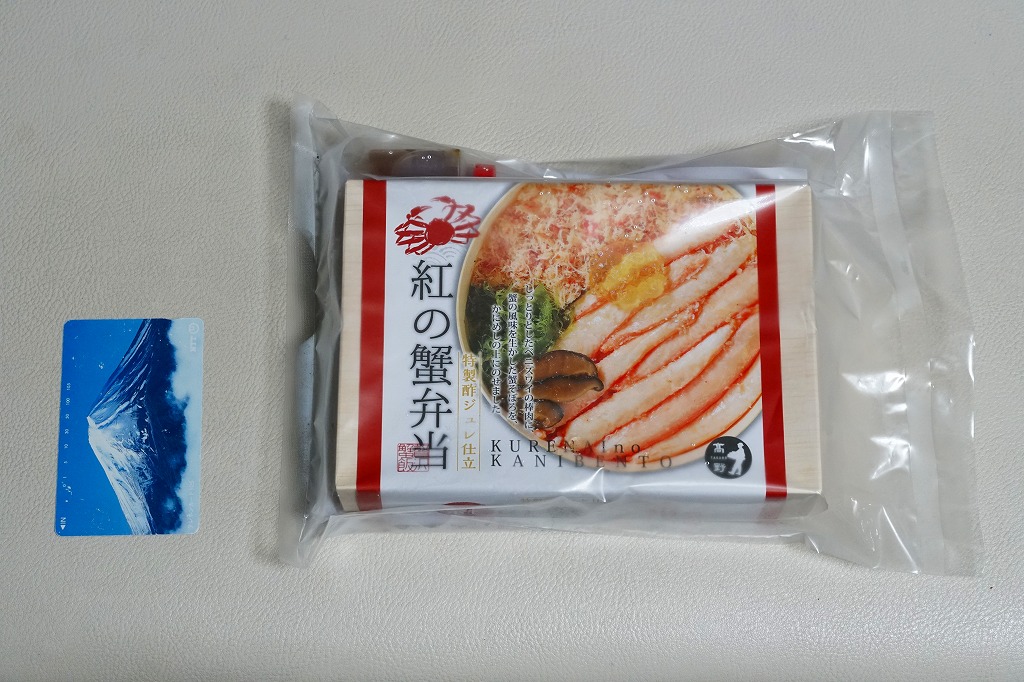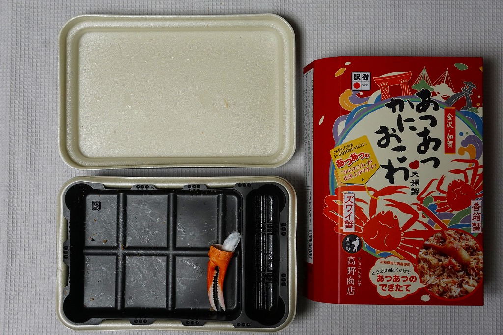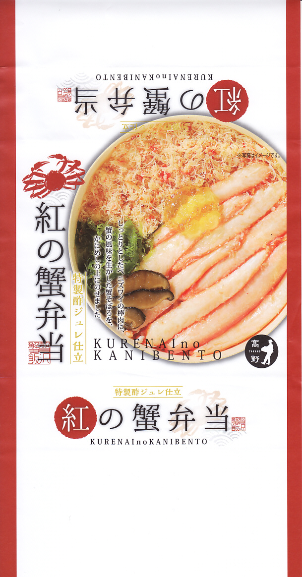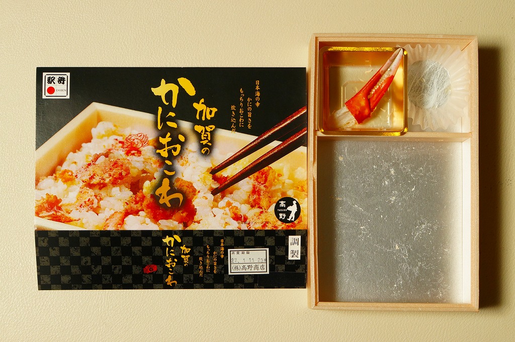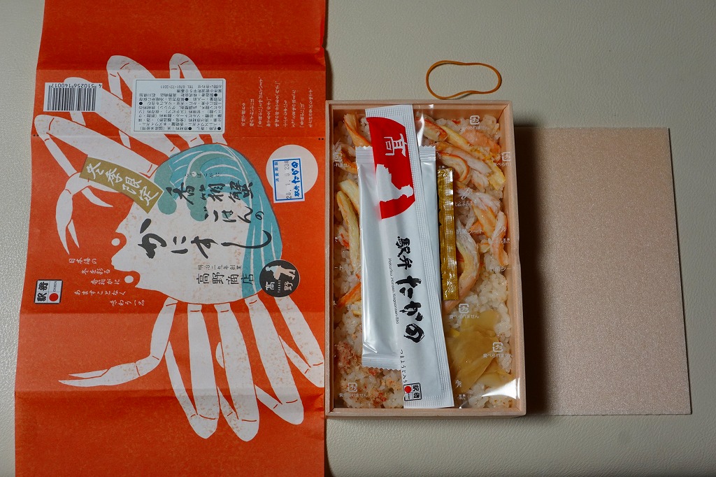 2014(平成26)年1月の京王百貨店の駅弁大会でデビューか。京王百貨店駅弁大会以外で売られたことはあるのだろうか。カニほぐし身を混ぜたおこわに、カニ脚肉を1本置いて、カニ爪、サトイモ、タケノコ、小松菜などを添える。見た目でも風味でもカニが控えめ過ぎる印象だが、これだけ水気豊かな柔らかさがあるおこわは、常温の弁当では初めての体験だった。翌2015年の京王百貨店の駅弁大会でも輸送販売されたが、何らかの理由で購入の翌日から来なくなってしまった。この時までの販売か。