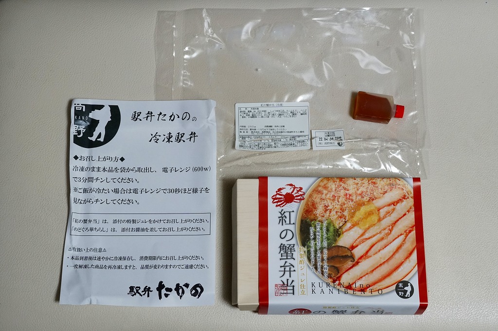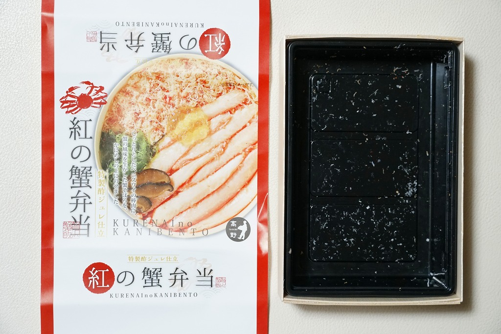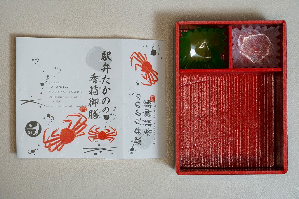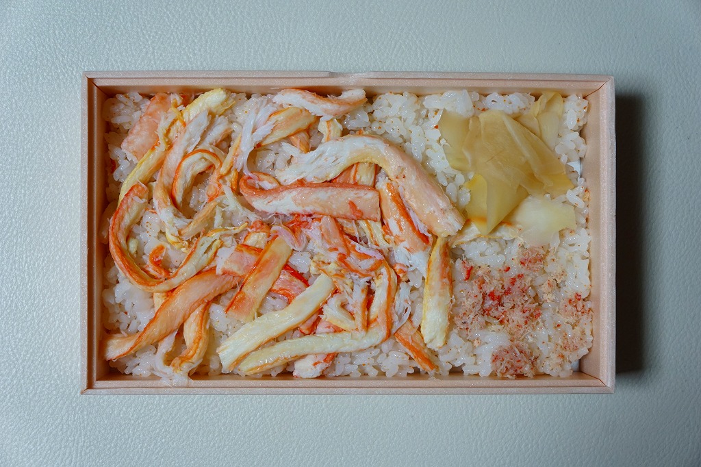 2014(平成26)年1月の京王百貨店の駅弁大会でデビューか。四角い容器いっぱいに甘い酢飯を詰め、カニ脚肉を同じ方向にとにかく並べ、甘酢生姜を添え、カニが華やかな絵柄の掛紙で包む。カニ脚は細身のベニズワイガニなので、豪華さや派手さは催事場の北海道駅弁に負けるが、そのツヤと香り、そしてカニをたくさん食べたなという満足感では負けない。カニの味と香りが自然に生きている感じを受け、落ち着きのある良い駅弁だと思った。価格は2014年の発売時で1,350円、2017年の購入時で1,200円、2019年時点で1,250円、2023年時点で1,380円。