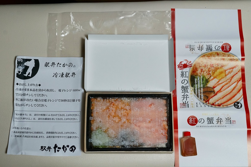 2017(平成29)年1月の京王百貨店の駅弁大会でデビューか。四角い容器に酢飯を詰め、ベニズワイガニの脚肉とほぐし身、香箱蟹の内子と外子のペースト、いくら、ガリで覆う。珍味の味と香りが自然に生きている感じを受け、落ち着きのある良い駅弁だと思った。ただ、めったに売られない商品であるかもしれない。この冬限りで終売か。2021年に中身と値段を変えて再発売か。