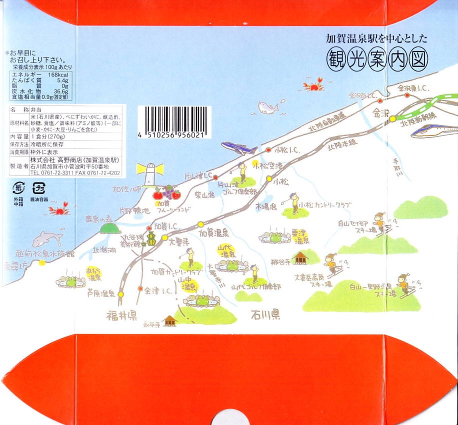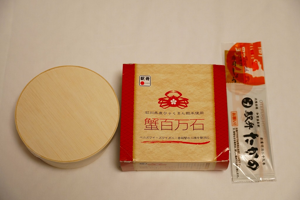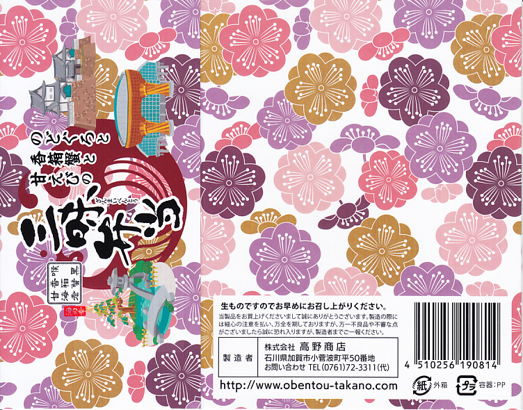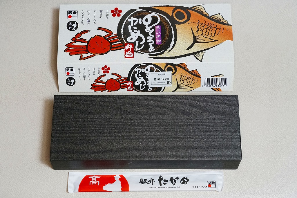 調製元は加賀温泉駅の駅弁屋だが、この頃には金沢駅の駅弁と宣伝するようになり、2015年3月の北陸新幹線開業以降は加賀温泉を名乗らなくなったと思う。もとは1896(明治29)年に福井県の今庄駅で創業し、1962(昭和37)年に東の石川県の大聖寺駅へ移転、さらに1970(昭和45)年に1駅東の加賀温泉駅へ移転した駅弁屋なので、さらに東へ行ってもおかしくない。