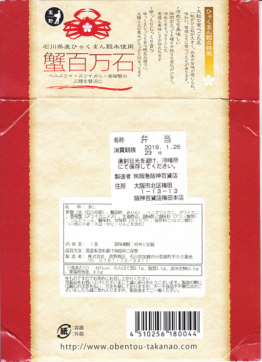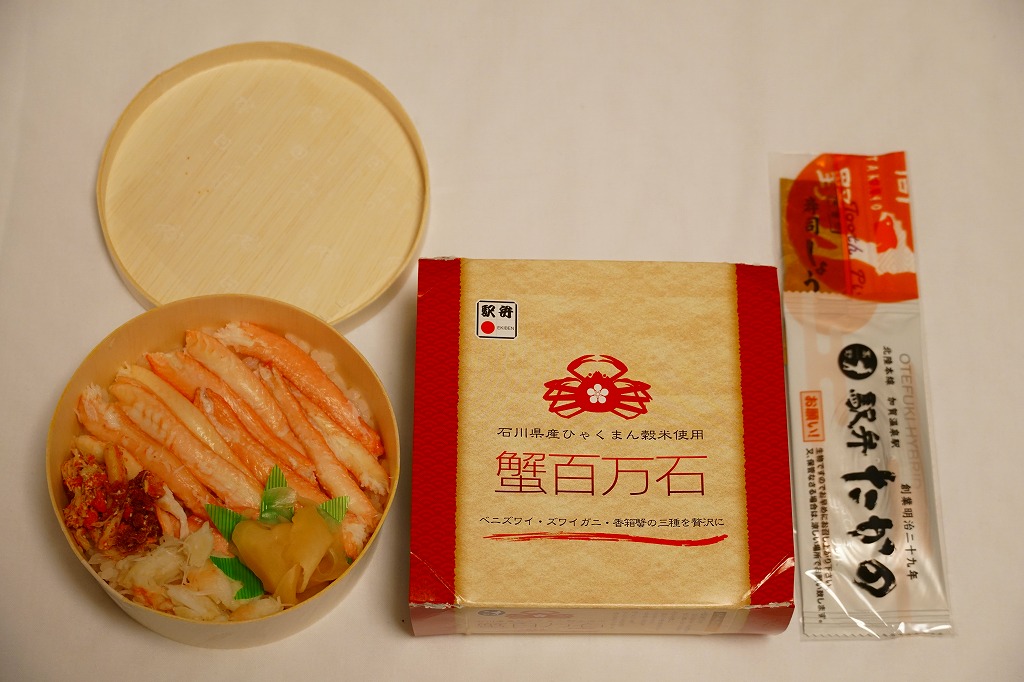 2019(平成31)年1月1日に金沢駅と加賀温泉駅で発売。駅弁の名前は江戸時代の加賀版の石高に由来する加賀百万石から来ているのではないかと思ったら、2017(平成29)年発売の石川県産米「ひゃくまん穀」の宣伝文がスリーブにあり、こちらのほうが由来かもしれない。中身は円形の容器に酢飯を敷き、ベニズワイガニの棒肉、ズワイガニのほぐし身、香箱蟹(ズワイガニのメス)の内子や外子などの和え物で覆うもの。つやつやのカニ脚と蟹ほぐし身に、濃厚な香箱蟹で、柔らかくてきれいなカニ丼。