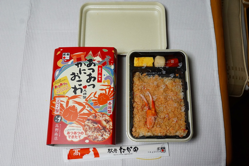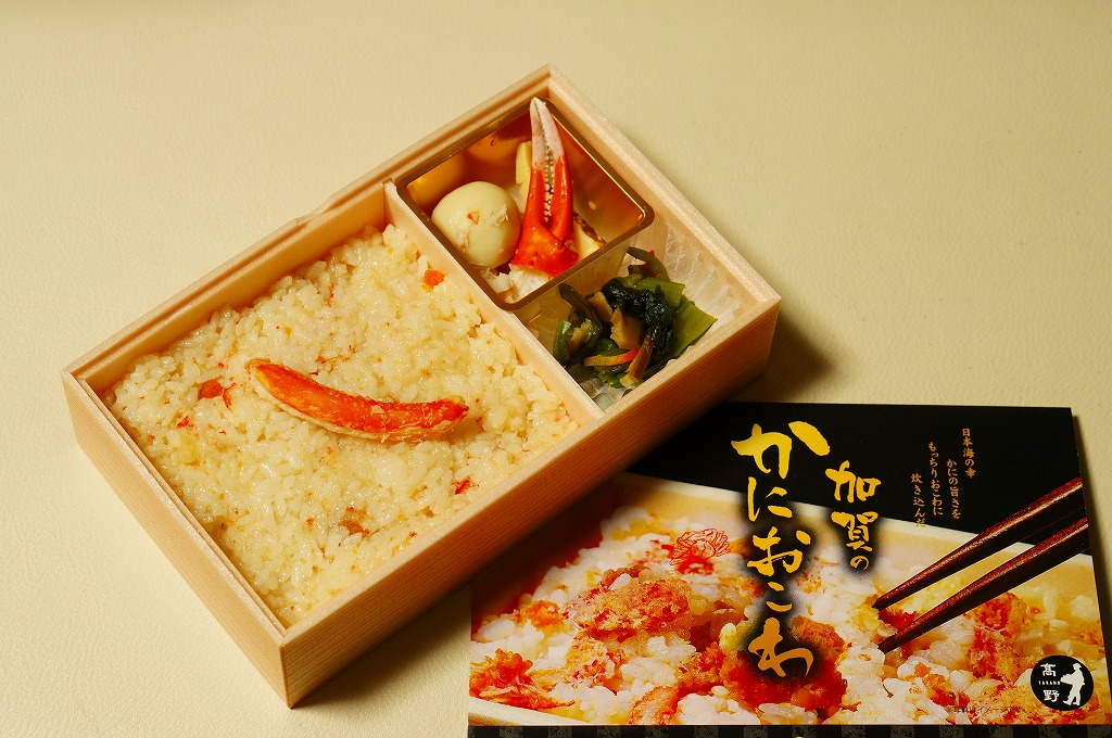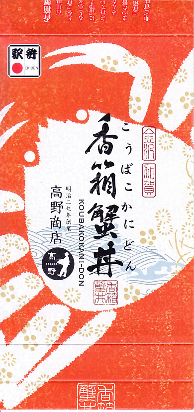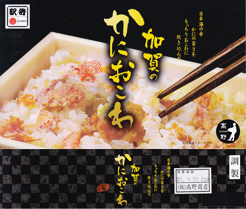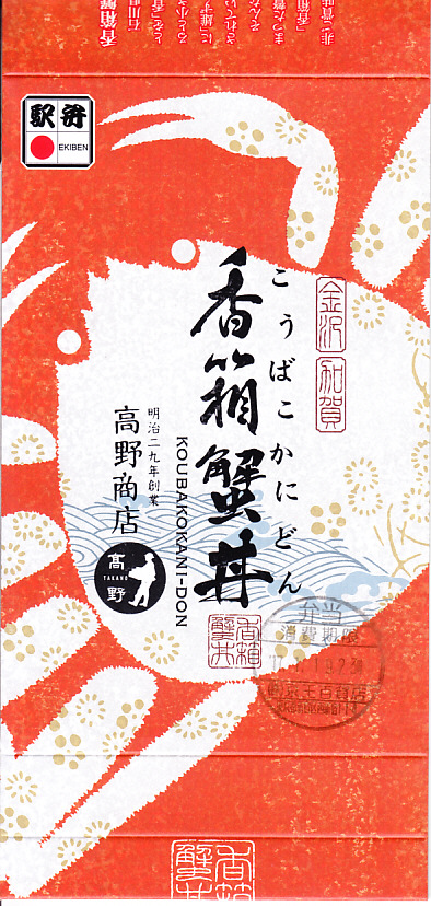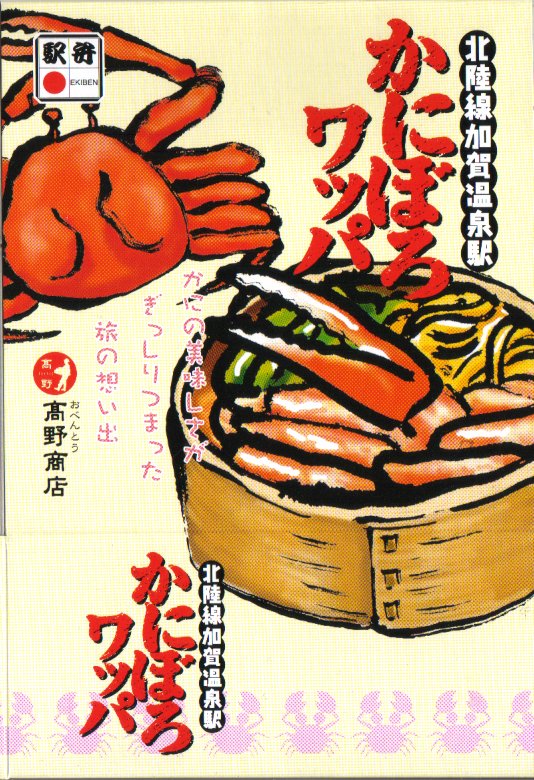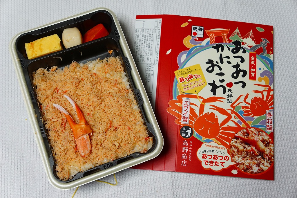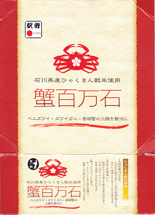 2018(平成30)年1月の京王百貨店の駅弁大会で販売。翌2月に金沢駅か加賀温泉駅で販売された模様。以後の存廃は不詳。長方形の加熱機能付き容器に茶飯を敷き、カニほぐし身で覆い、カニ爪を置き、ニンジンとサトイモと玉子焼を添える、古典的な内容のカニ駅弁。スリーブの絵柄のような派手さはなく、これも無難な安心感。値は張る。この冬限りで終売の模様。