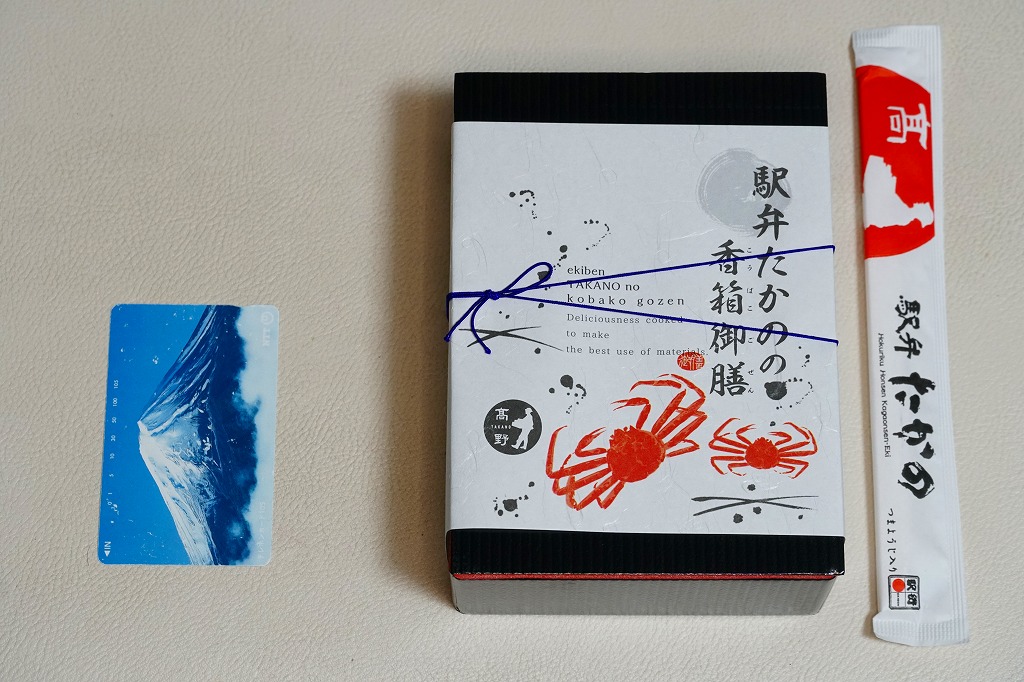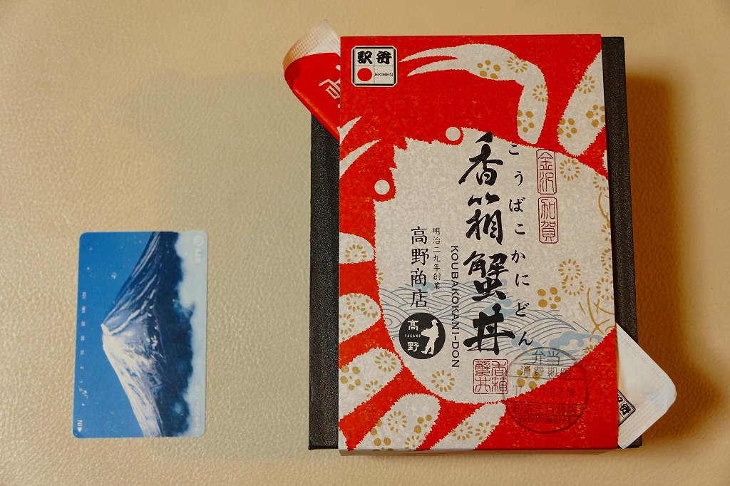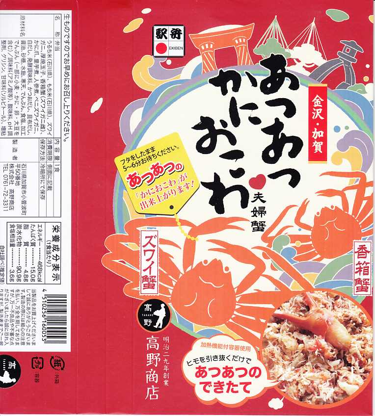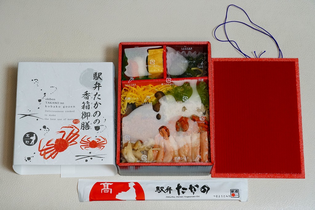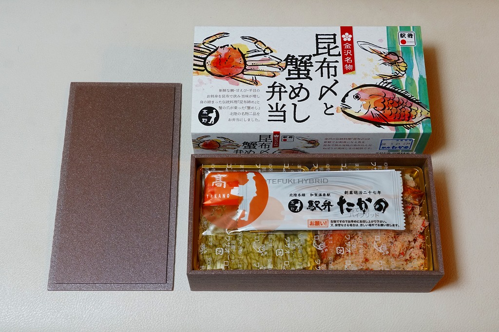 2018(平成30)年1月の京王百貨店の駅弁大会で販売。翌2月に金沢駅か加賀温泉駅で販売された模様。以後の存廃は不詳。長方形の加熱機能付き容器に茶飯を敷き、カニほぐし身で覆い、カニ爪を置き、ニンジンとサトイモと玉子焼を添える、古典的な内容のカニ駅弁。スリーブの絵柄のような派手さはなく、これも無難な安心感。値は張る。この冬限りで終売の模様。