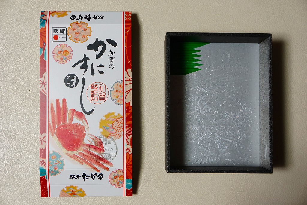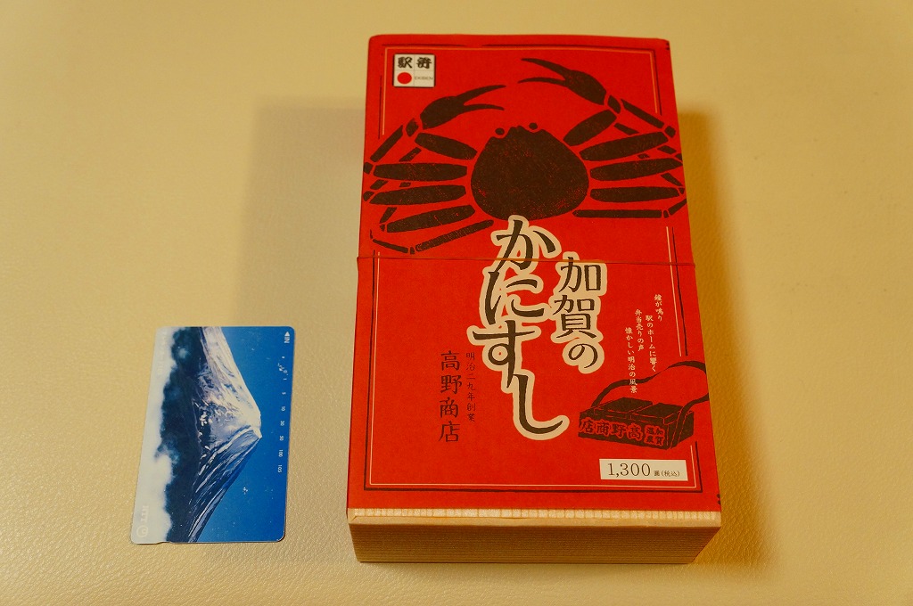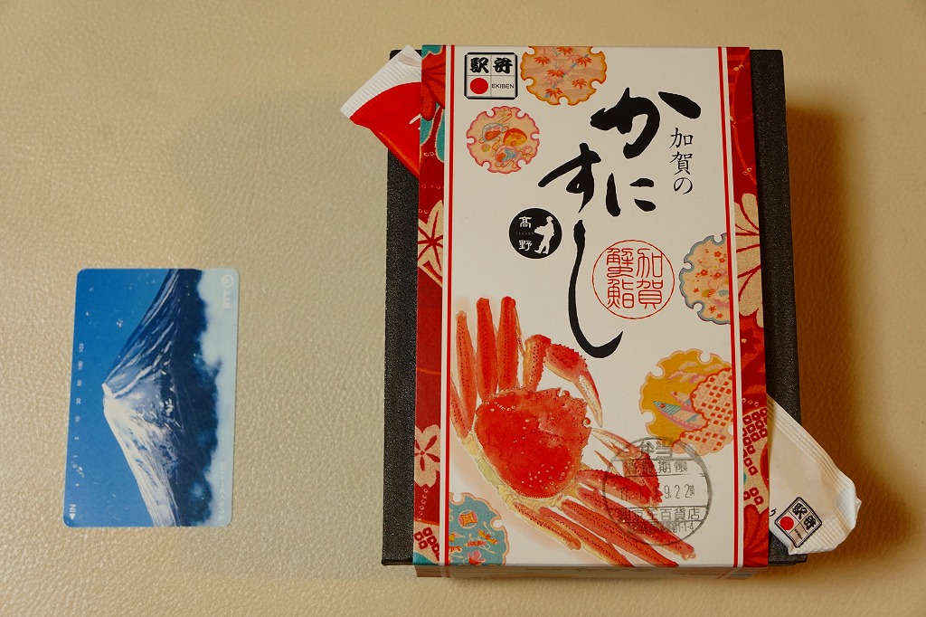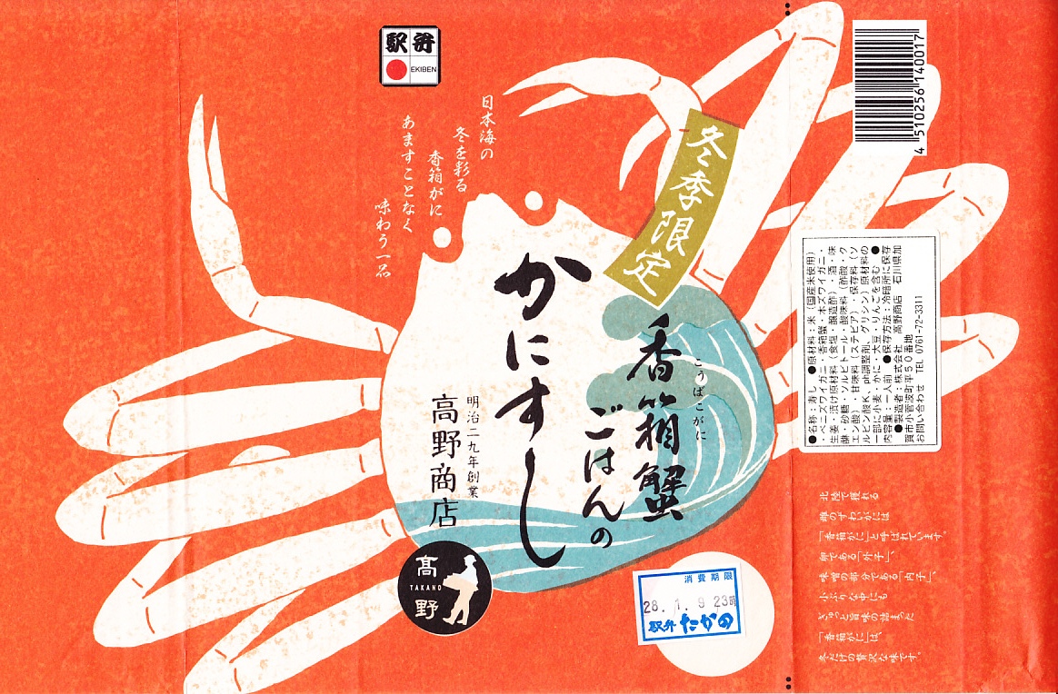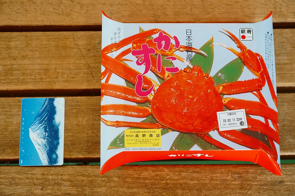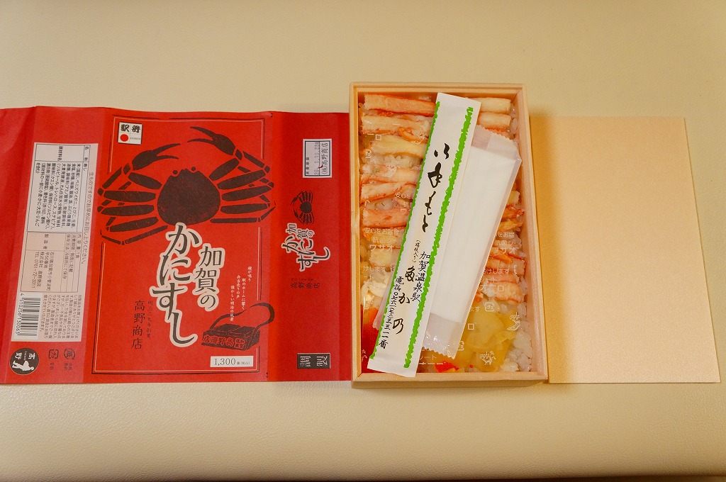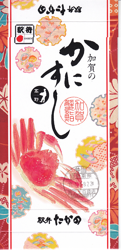2014(平成26)年1月の阪神百貨店の駅弁大会でデビューか。掛紙にあるとおり冬季限定で、金沢駅と駅弁大会で売られる。そんな新しい駅弁らしからぬ、古風な絵柄と風合いの掛紙を使う。中身は酢飯を30本くらいのカニ脚と、少々のカニほぐし身とガリで覆うもの。同じ調製元でカニ棒肉がきれいに整列する「加賀のかにすし」より、食べた際の柔らかいカニの存在感は大きいと感じる。価格は2014年の発売時で1,360円、2015年時点で1,480円、2023年時点で1,680円。