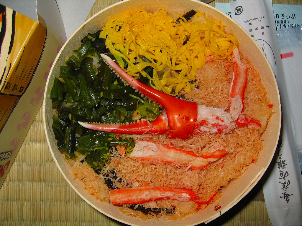 ※2015年9月補訂:終売を追記2001(平成13)年に発売。越前焼の美しい容器を使用し、中身はカニの爪と脚肉と炒り身(ぼろ)が錦糸卵などと一緒に酢飯の上に載せられるカニ弁当。量は少なく、価格の多くは容器代に費やされているようだが、確かに容器に手抜かりはなく、茶碗として十分実用に耐えるばかりでなく観賞用にも向く。