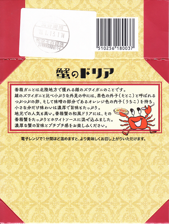 2019(平成31)年1月1日に金沢駅と加賀温泉駅で発売。同月の京王百貨店の駅弁大会での実演販売でデビュー。ドリアの駅弁など、他に聞いたことがない。ズワイガニやベニズワイガニのカニ飯に、香箱蟹(ズワイガニのメス)入りのホワイトソースをかけ、カニ脚、ズッキーニ、さつまいも、赤パプリカ、レンコン、ヤングコーン、しめじを散らし、チーズをかけてオーブンで焼く。これは冷めてもおいしいカニドリア。とてもユニークな駅弁が出てきたものだと思う。2022年までの販売か。