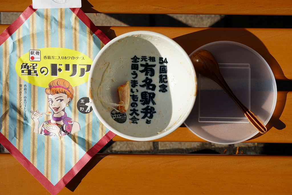 2019(平成31)年1月の京王百貨店の駅弁大会で実演販売。上記の駅弁「蟹のドリア」を、京王百貨店駅弁大会限定で、その名を記した特製どんぶりに入れて販売した。2018年の水戸駅「常陸牛山椒風味カルビ弁当」、2017年の鳥取駅「山陰鳥取かにめし」、2016年の米子駅「海の宝箱丼」、2015年の名古屋駅「抹茶ひつまぶし日本一弁当」と同じ。今回は中身がドリアなので、通常版の紙カップよりもこちらの器のほうが、おいしくて食べやすかった。また、こちらはスリーブでなく掛紙を使ったので、よりさらに駅弁らしくも見えた。