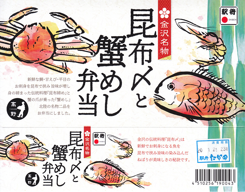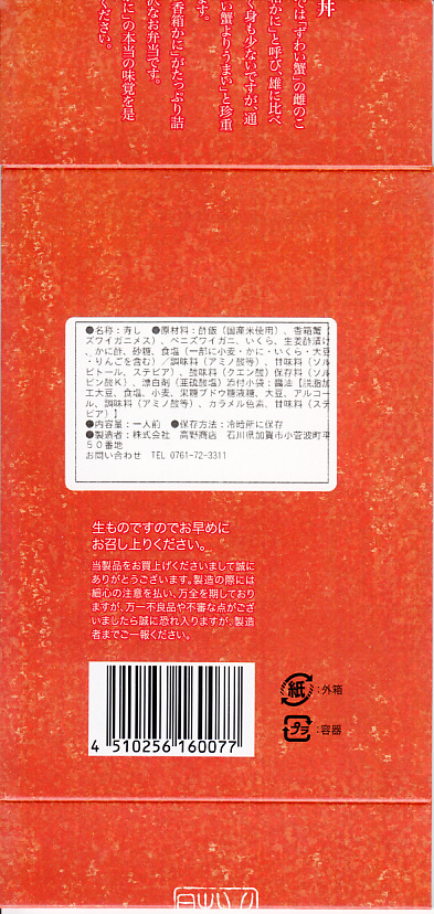 エビとカニを描いた正方形ふたつぶんのボール紙製容器を使用、ふたを開けると裏側に簡単なコラムが載る。その中にレンジ対応のプラ製食品トレーがふたつ入り、片方には酢飯の上に海老や山菜や椎茸が、もう片方には御飯の上に細かいカニほぐし身が、それぞれ載っている。いずれもしっかり硬く押されているのは加賀の伝統か。これに加えてプラ容器の形状により、中身の品質にかかわらず少々の味気なさを覚える。裏ぶたのコラムともども、何らかの強化策が欲しい感じ。2005年までの販売か。