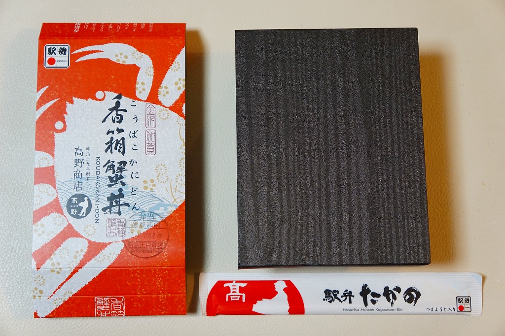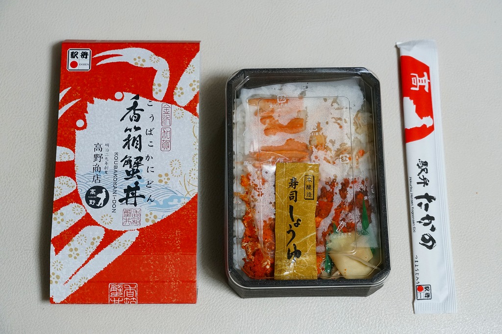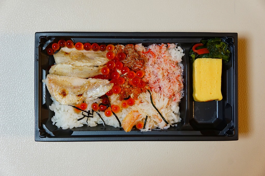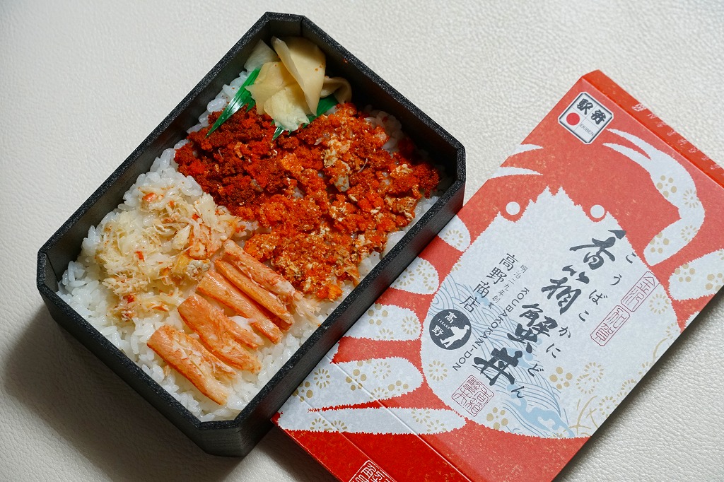 冬季限定の駅弁と表示して、2021(令和3)年以降に百貨店の催事場で実演販売されているらしい。下記の駅弁「香箱蟹丼」と同じスリーブに、ふたが透明な黒い容器をはめる。中身は酢飯を、香箱蟹(こうばこがに:石川県で水揚げされたメスのズワイガニ)の外子(腹の卵)と内子(甲羅の中の未成熟卵)、ベニズワイガニの棒肉とほぐし身で4分の1ずつ覆い、ガリを添える。カニの身より多い卵を存分に味わえる。小さいメスやベニズワイガニが安価でお徳だったり、ズワイガニと不当表示して売った時代は、もう10年以上前のこと。今では絶品グルメや高級食材として、これだけ高額な商品になった。