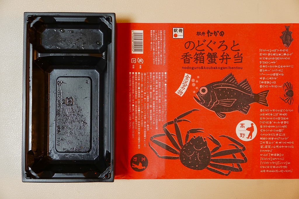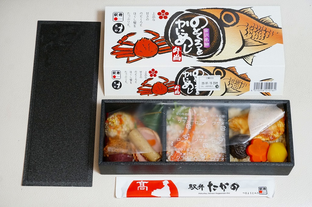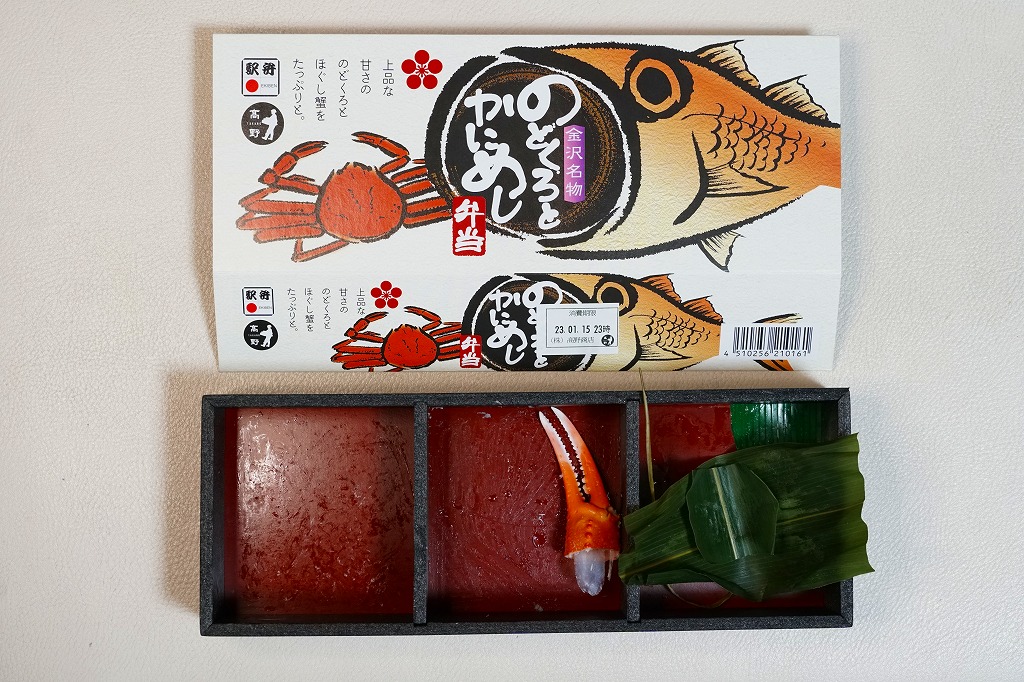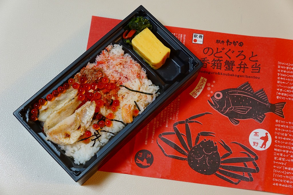 2023(令和5)年1月の京王百貨店と阪神百貨店の駅弁大会で輸送販売。ノドグロとカニのイラストを描くスリーブに収めた、正方形3個分の細長い容器で、茶飯をのどぐろ(アカムツ)焼と栗と人参と椎茸を覆い、カニ飯をベニズワイガニとズワイガニのそぼろと爪ととさかのりで覆い、あられ海老団子、有頭海老、海老旨煮、白身魚揚げ、金時、鴨煮、ごぼう、笹麩饅頭を詰める。そんな構成なので、「たっぷりと」の宣伝文に違い、駅弁の名前になるノドグロとカニの存在感はそれほどでもないため、幕の内弁当のように機能的な食事に思えた。