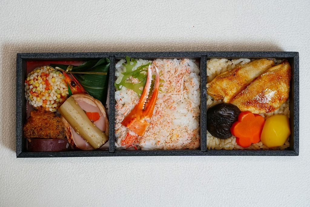 この駅弁大会での駅弁の実演販売では、最も長い行列を作っていたと見える。脂がほどほどに豊かなノドグロの切り身焼きが良いおかずになり、香箱蟹の味噌と卵と身がまた良い滋味を出し、しかしいずれも単品や大量に入れると食べていて飽きが来ると思うので、百貨店の公式ブログで紹介するとおりの「ベストマッチ!」。なお、今回買った品は、新作を大量に製造していたからか、具の詰め方が雑だったと思う。価格は2016年の発売時で1,600円、2019年時点で1,700円。2020年までに終売か。