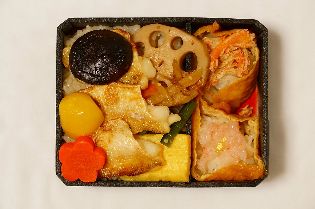 2020(令和2)年1月の京王百貨店の駅弁大会、阪神百貨店の駅弁大会、2月の鶴屋百貨店の駅弁大会で実演販売。茶飯をレンコンと玉子焼と小松菜やシイタケなどと、のどぐろ焼き3枚で覆うとともに、金粉をまぶしたカニとエビのおいなりさん各1個という、飯と飯の駅弁。見た目の良い小箱で、良いおつまみになるとも評された。2022年までの販売か。