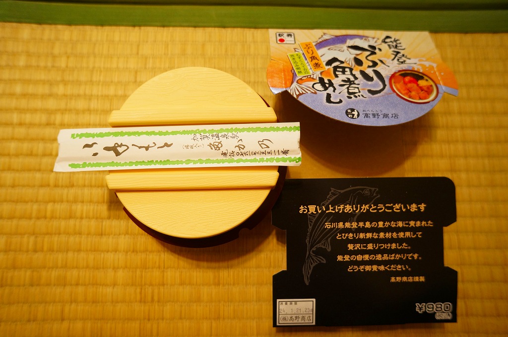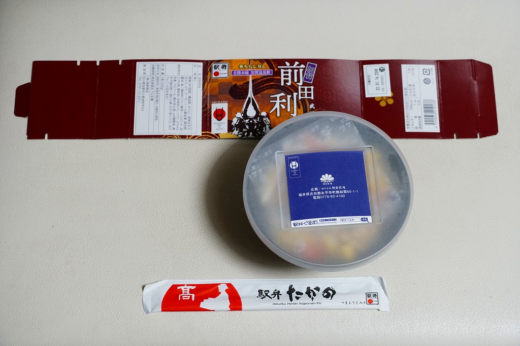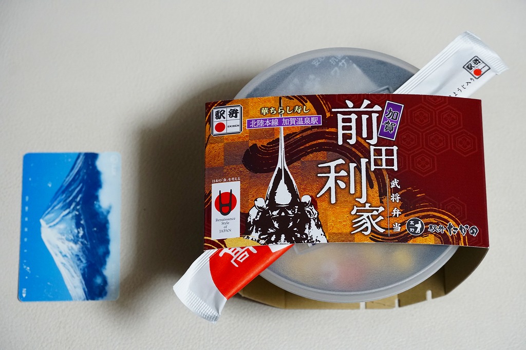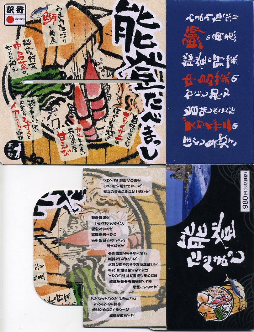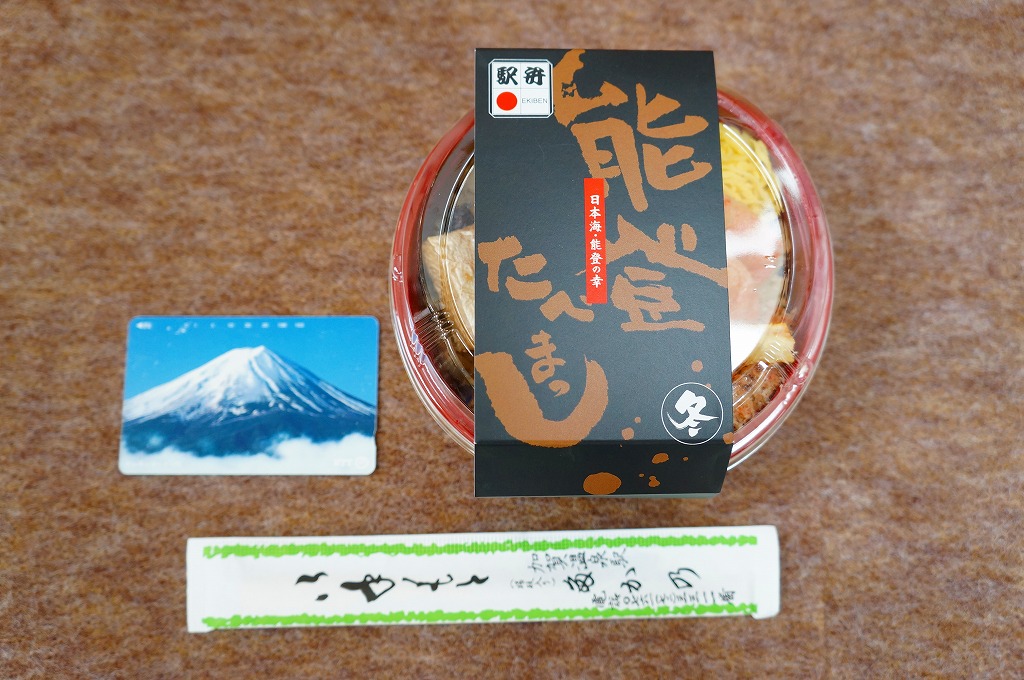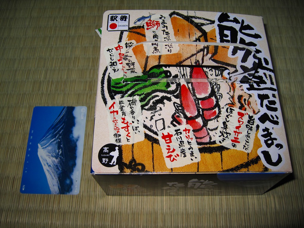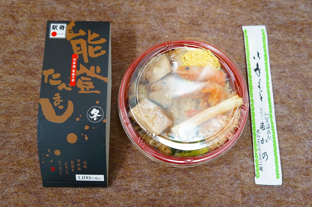 「たべまっし」とは加賀や能登つまり石川県の方言で「食べてみませんか」の意味だそうな。アマエビが香り、ブリが味を広げ、柔らかい御飯が合い、中島菜がピリッと締める、食べておいしいお弁当。なお、加賀温泉駅は能登から鉄道でも車でも2時間以上は離れている。
