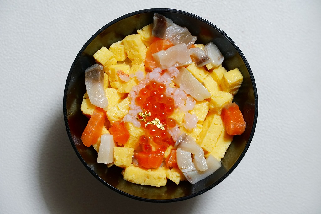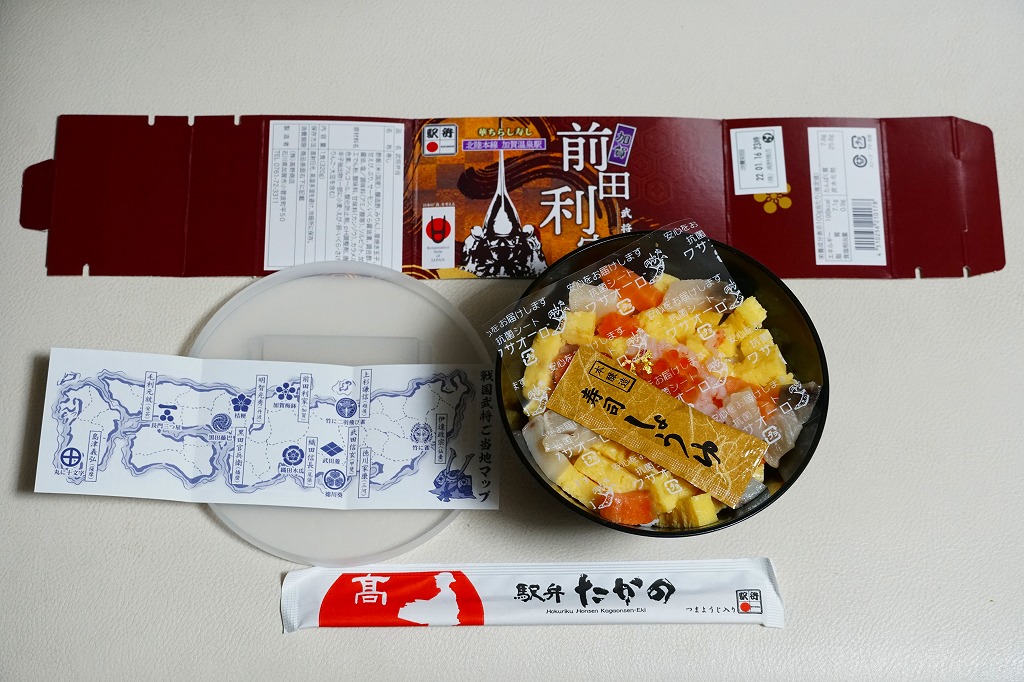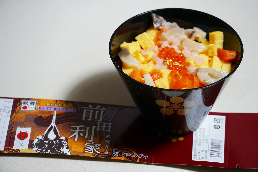 今回は黒いプラ容器が円錐状とボウル状で2種類あり、この前田利家は円錐状のもの。これに前田家の家紋を入れ、日本古窯弁当と同じ半透明のふたをして、今回のシリーズで共通のしおりを置き、それらしき絵柄のスリーブで留める。中身は酢飯をサイコロ状の玉子焼、ぶり、サーモンで覆い、イクラ、甘えび、金箔で彩るもの。戦国きっての傾奇者前田利家をイメージした海鮮ちらし寿司なのだそうだが、傾奇(かぶき)なんてとんでもない、見ても食べても美しく柔らかいお魚どんぶり。この中身を転用した、駅で売る弁当の出現を期待したい。3月までには終売か。