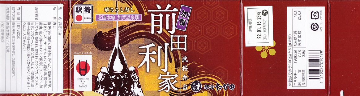 前田利家は、現在の愛知県名古屋に生まれ、現在の石川県や富山県を治めた戦国時代の武将。織田信長のち豊臣秀吉に仕え、所領を得たり出世した。槍の名手、長身のイケメン、そして傾奇者(かぶきもの:見た目や行動が異様な者)であったなどと伝わる。駅弁では2002年のNHK大河ドラマ「利家とまつ」の放送により、金沢駅に「利家御膳」が生まれたが、江戸時代に加賀藩前田家の御膳所御料理方を務めたその調製元と、この駅弁(ではないかもしれないが)の調製元は異なる。