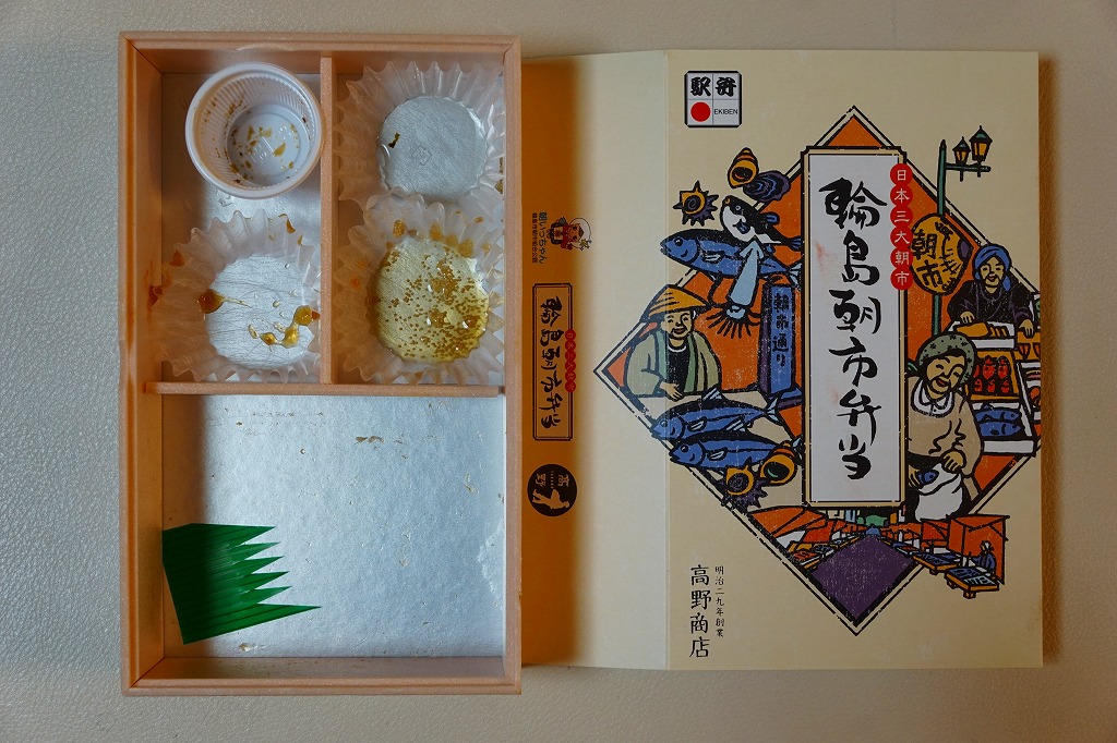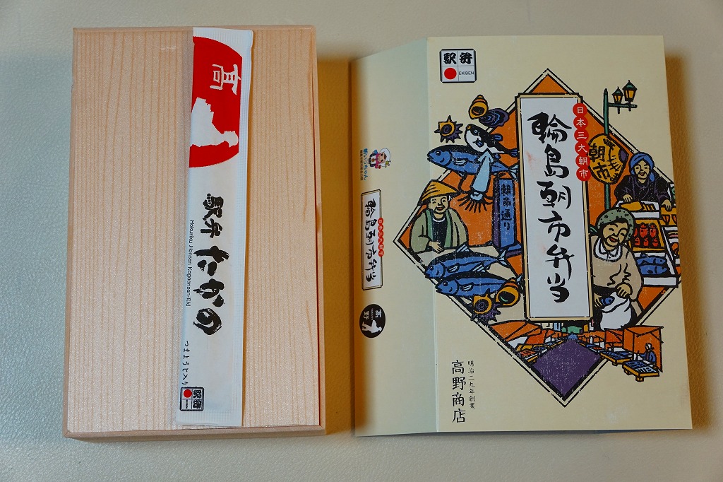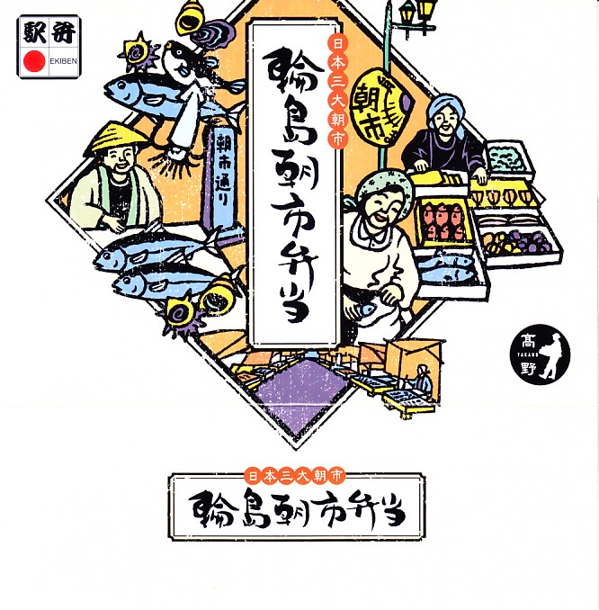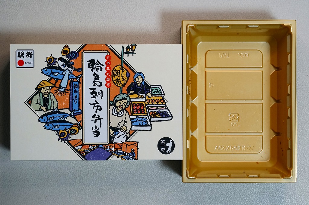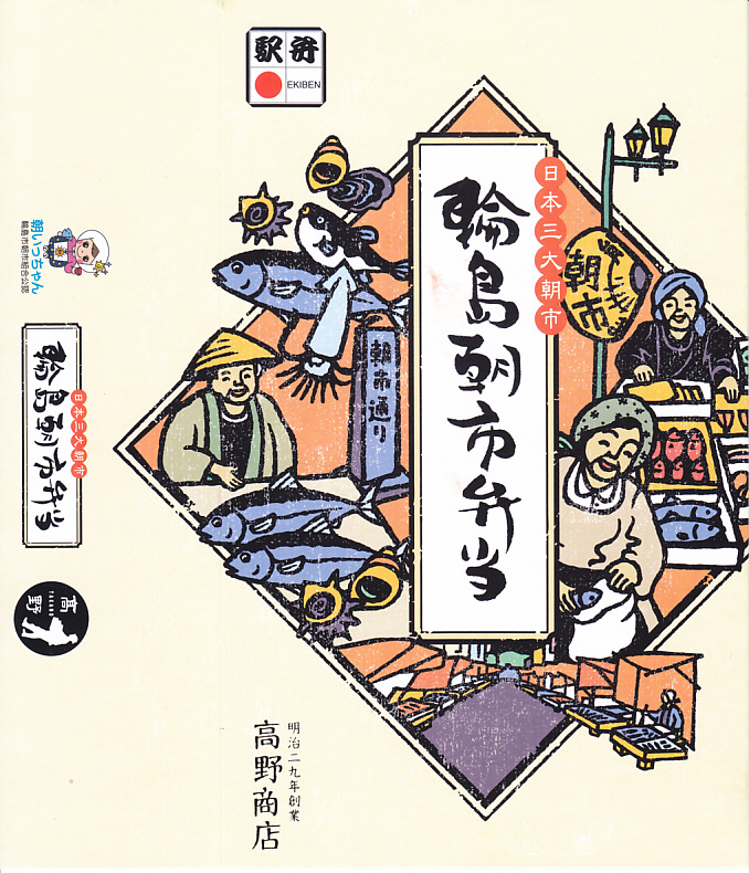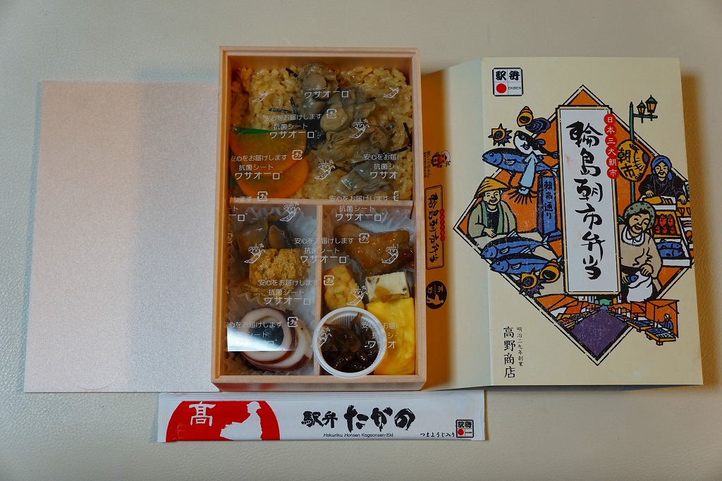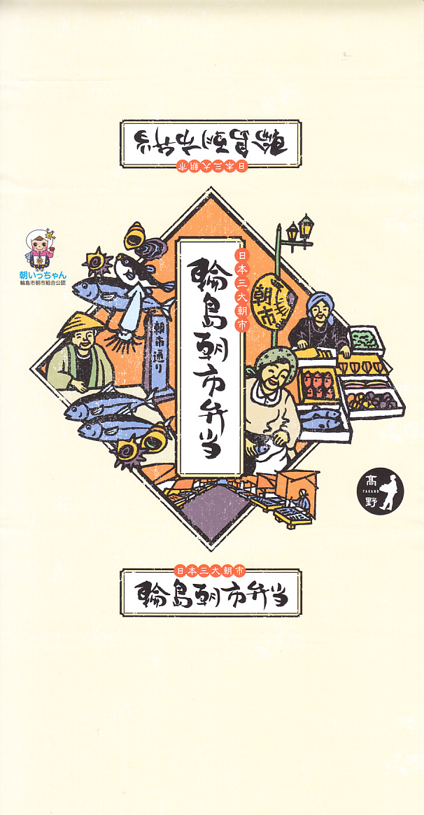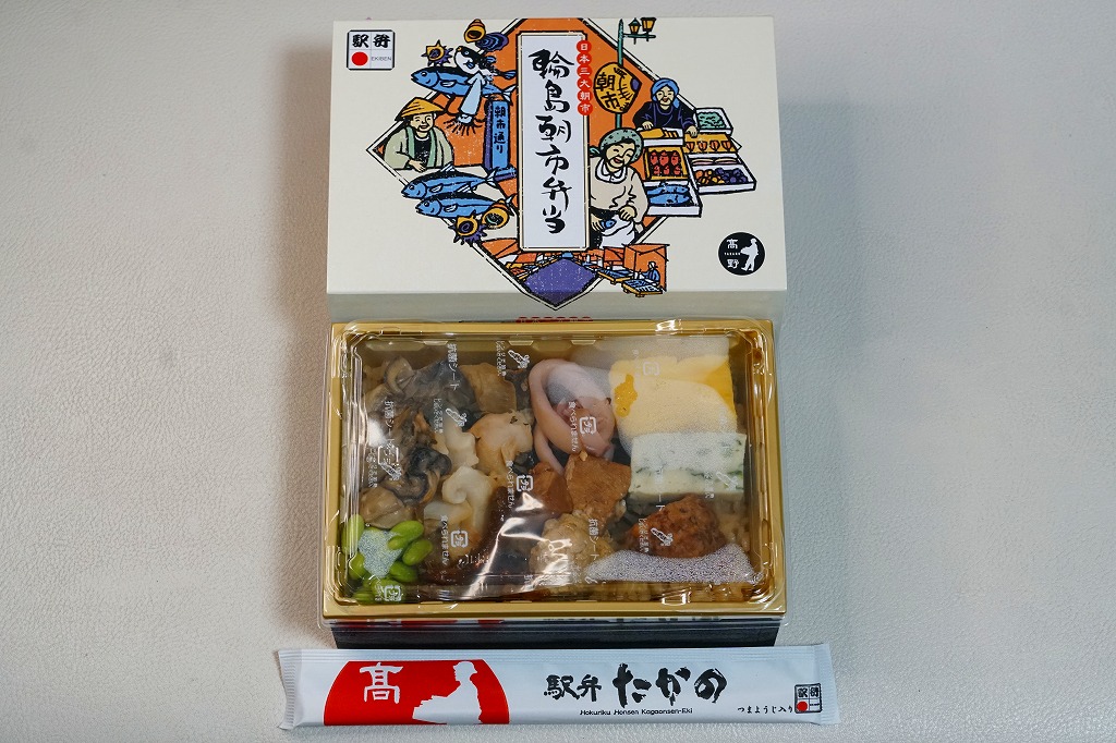 2015(平成27)年8月に金沢駅で発売、2024年9月頃にリニューアル。調製元は石川県の西端にある加賀温泉駅の駅弁屋だが、片道3時間以上離れている石川県の北端で朝市が有名な輪島の、輪島朝市組合公認のお弁当だという。スリーブには能登の朝市の雰囲気を表すイラストが描かれる。