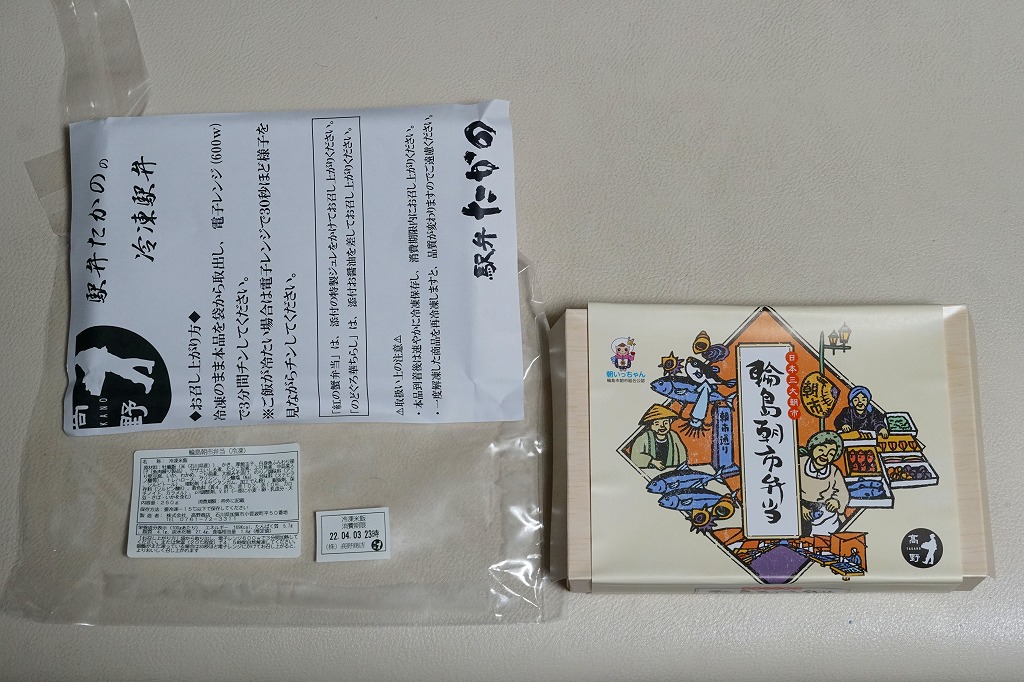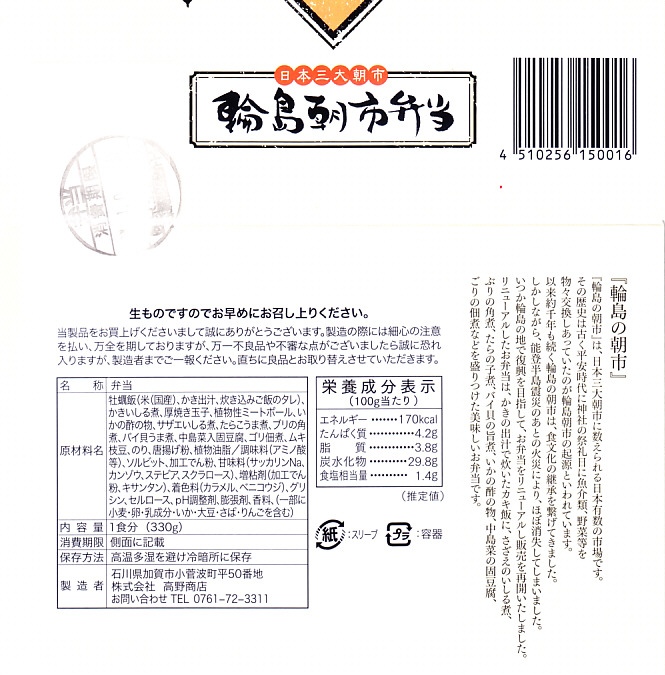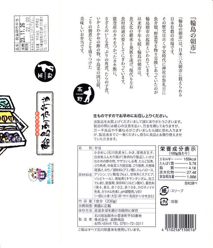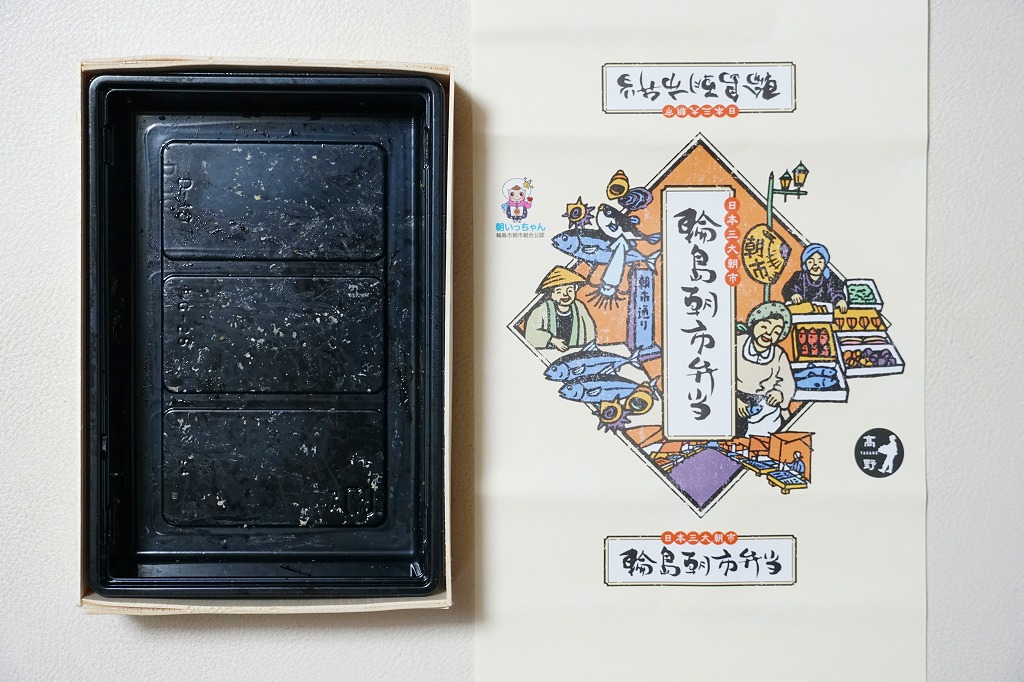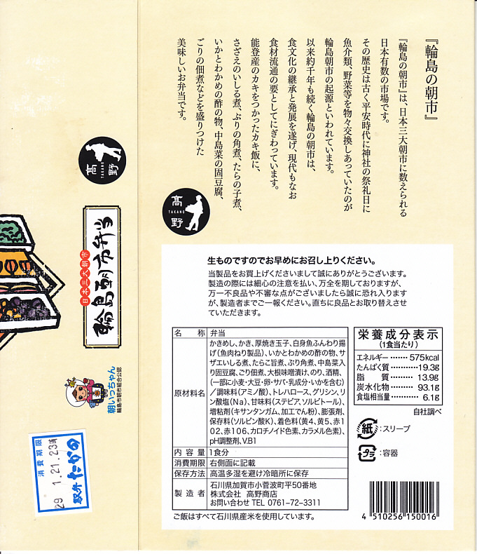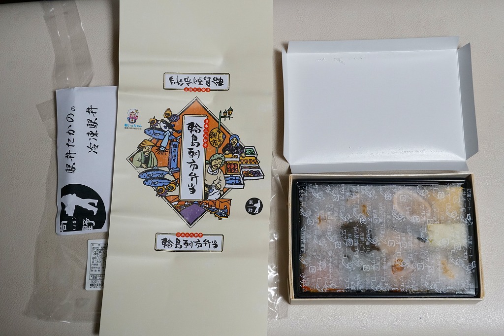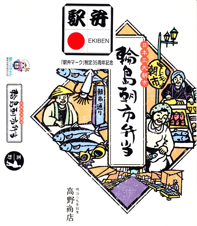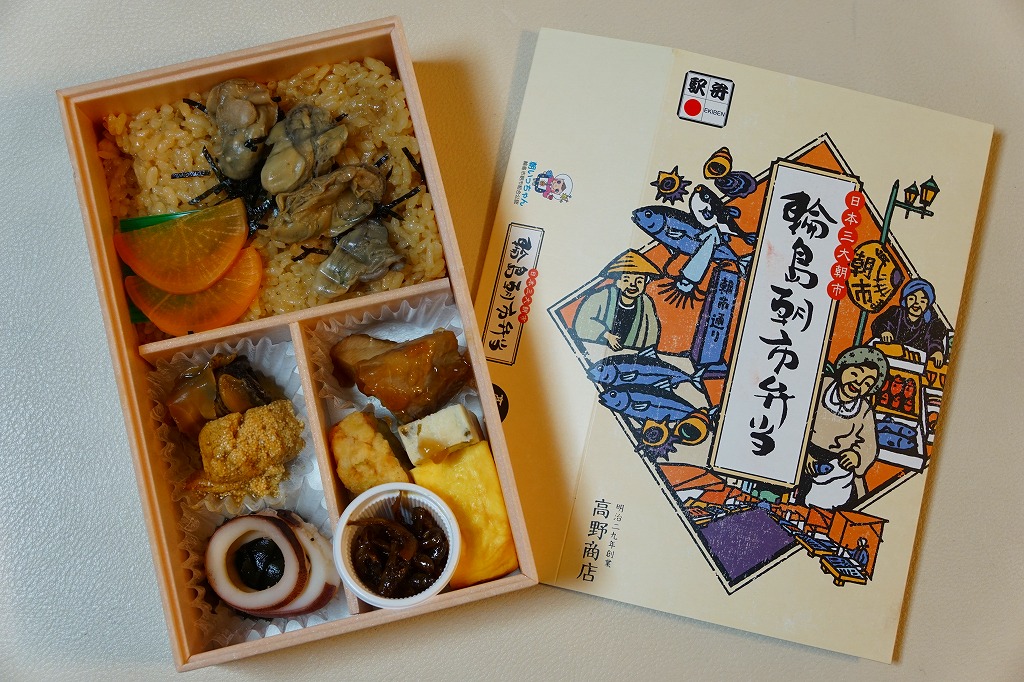 2015(平成27)年8月に金沢駅で発売、2024年9月頃にリニューアル。調製元は石川県の西端にある加賀温泉駅の駅弁屋だが、片道3時間以上離れている石川県の北端で朝市が有名な輪島の、輪島朝市組合公認のお弁当だという。スリーブには能登の朝市の雰囲気を表すイラストが描かれる。