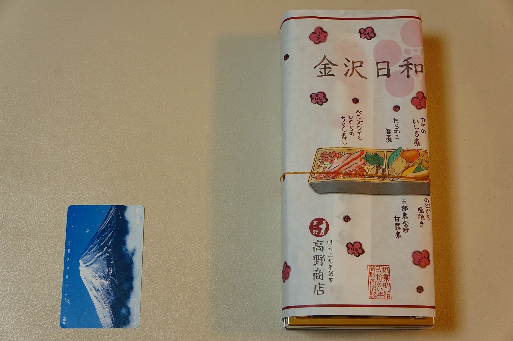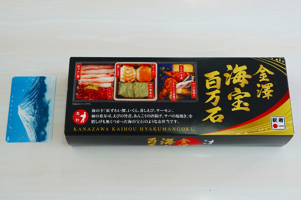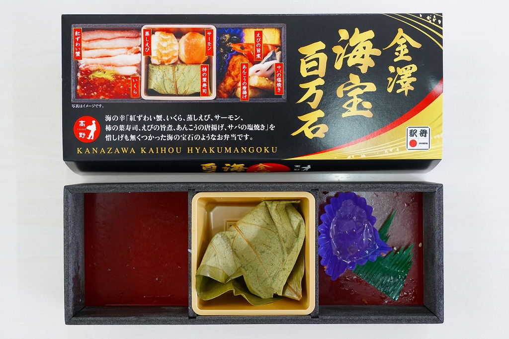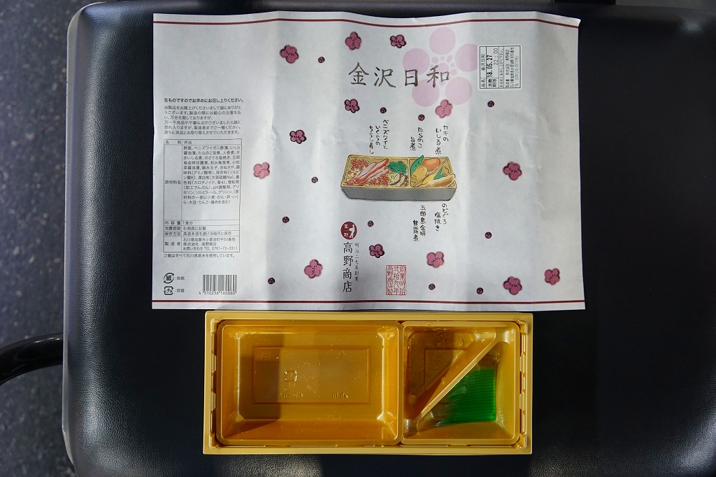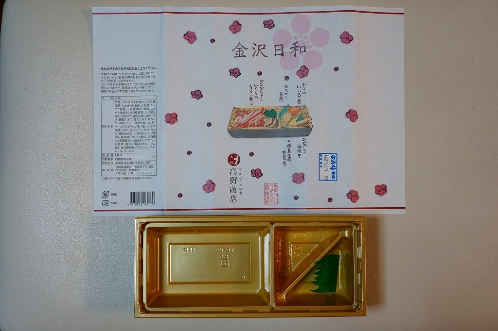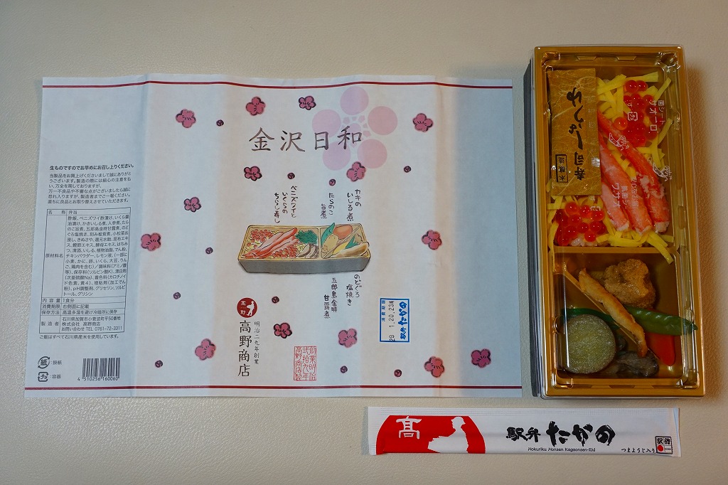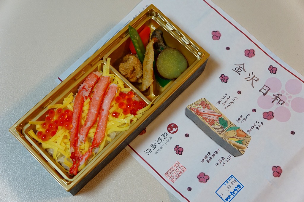 上記の駅弁「金沢日和」を、現地で買ったもの。名前も掛紙も中身も価格も同じ。カニの面積が見た目で半分になるなど、中身の見栄えに差異があり、催事場のもののほうが美しかった。価格は2018年の購入時で1,000円、2019年時点で1,100円。
