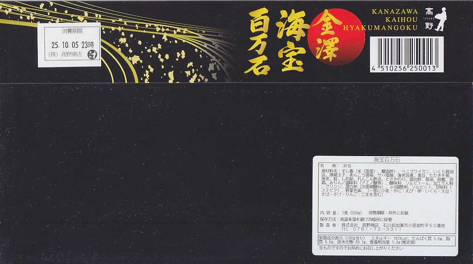 秋冬の駅弁大会シーズンに向けた、2025(令和7)年秋の新商品か。JR東日本の駅弁キャンペーン「駅弁味の陣2025」にエントリー。2022年秋冬のシーズンにも、同じ名前で容器や中身が異なる商品がスーパーで輸送販売されたらしい。横に3倍細長い容器も、商品名と中身の写真を載せたスリーブも真っ黒。中身は左側で酢飯を紅ずわい蟹といくらで覆い、中央でサーモンと蒸しえびのてまりずしと柿の葉寿司、右側でえびの甘煮、サバの塩焼き、あんこうの唐揚げ、しめさば、玉子焼、黒豆煮、酢れんこん。見た目がきれいで、内容と名前を含めて豪華さを感じる、海のもののお弁当。