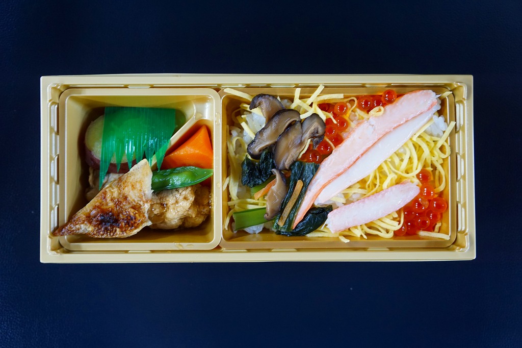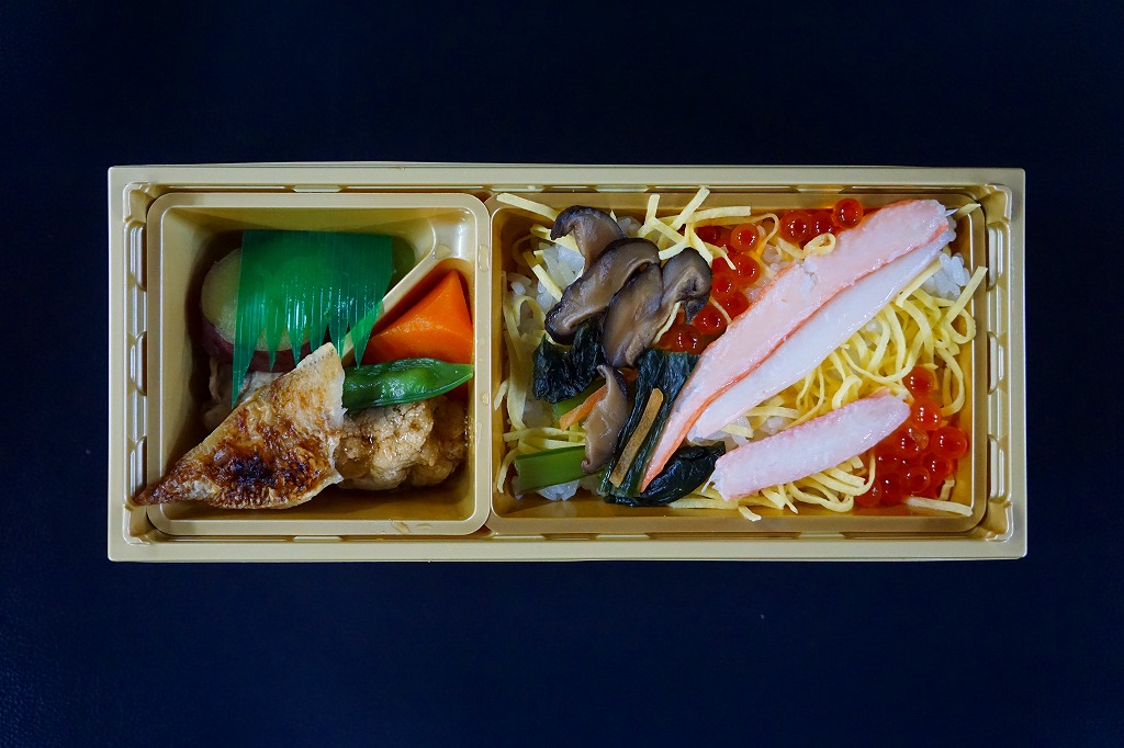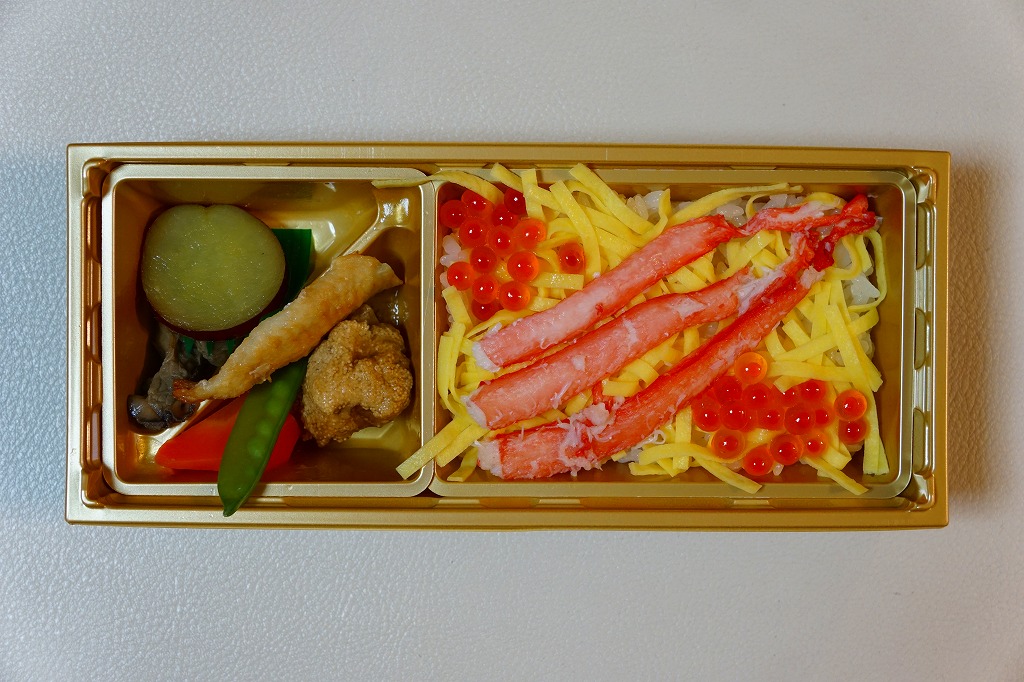 2017(平成29)年1月の京王百貨店の駅弁大会でデビューか。今回の京王でひっそりと集めて輸送販売していた、価格を1,000円に統一した各地の駅弁のひとつか。細長い容器の3分の2が、酢飯を錦糸卵とカニ脚肉とイクラで覆った「ベニズワイといくらのちらし寿し」のトレー、3分の1がカキのいしる煮、たらのこ旨煮、のどぐろ塩焼き、五郎島金時甘露煮という、主に煮物のトレー。珍味入り小腹向けな、中の上の駅弁として、あってもよい感じ。他の駅のこれらの千円駅弁はどうも、京王百貨店の駅弁大会でのみ売られたようだが、この駅弁は現地や他の駅弁大会にも出てきている模様。価格は2017年の発売時で1,000円、2019年時点で1,100円。