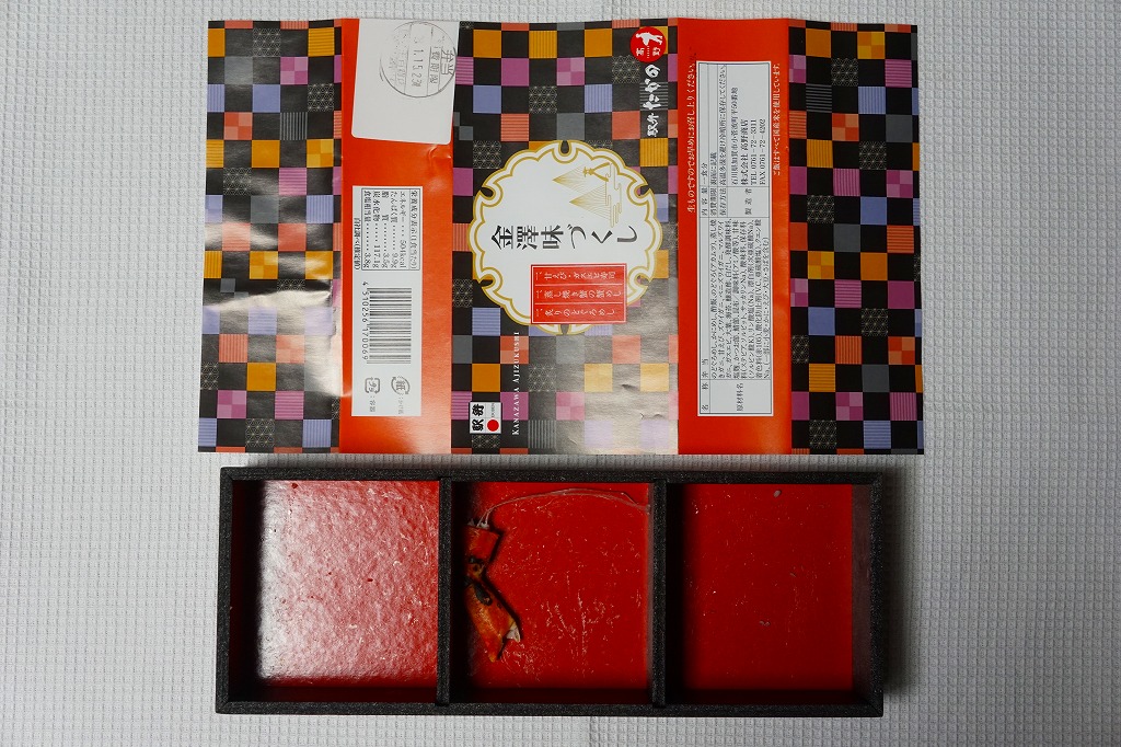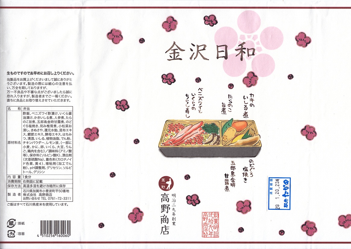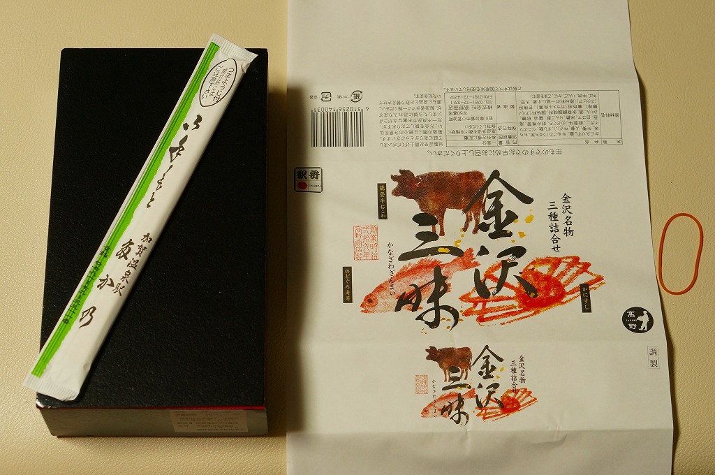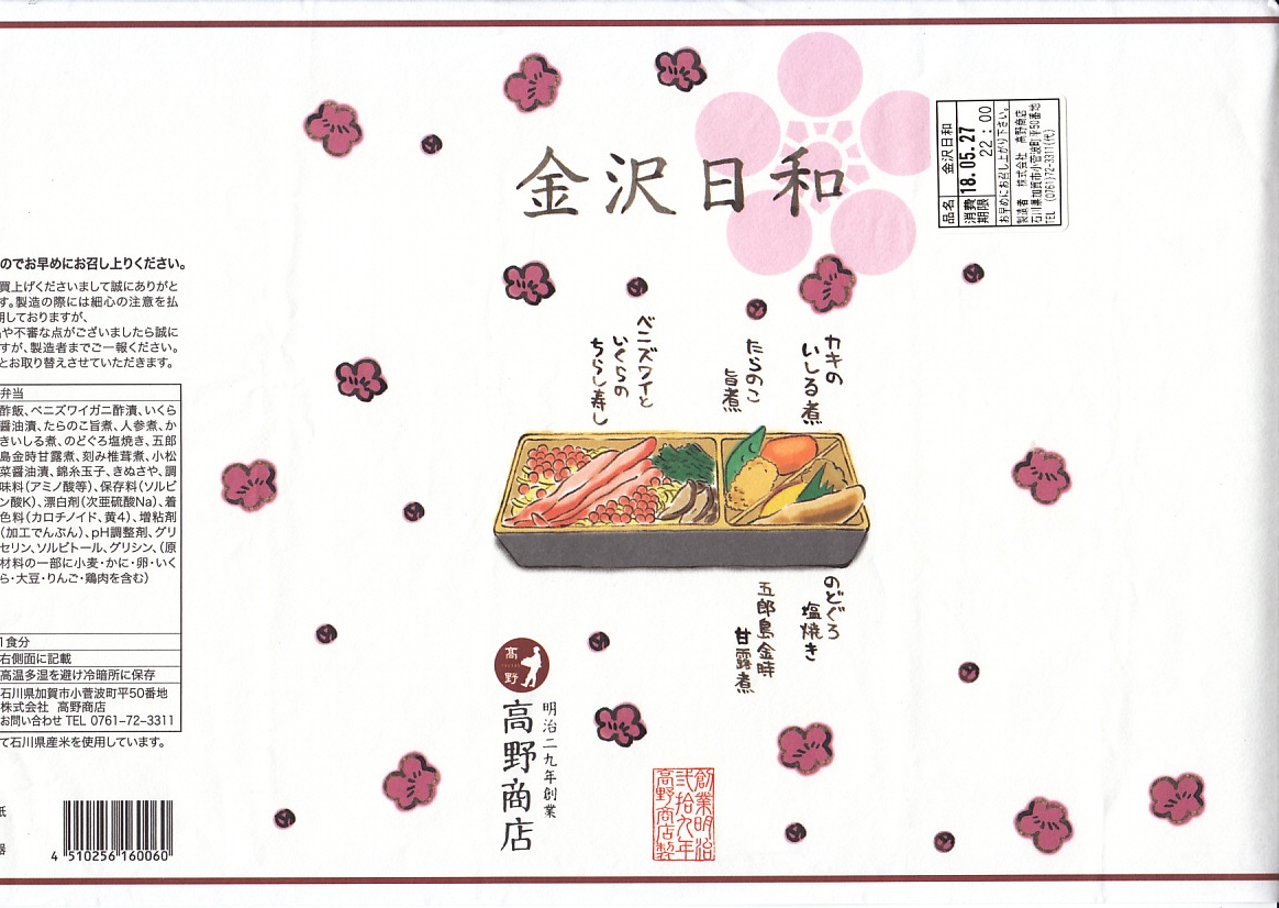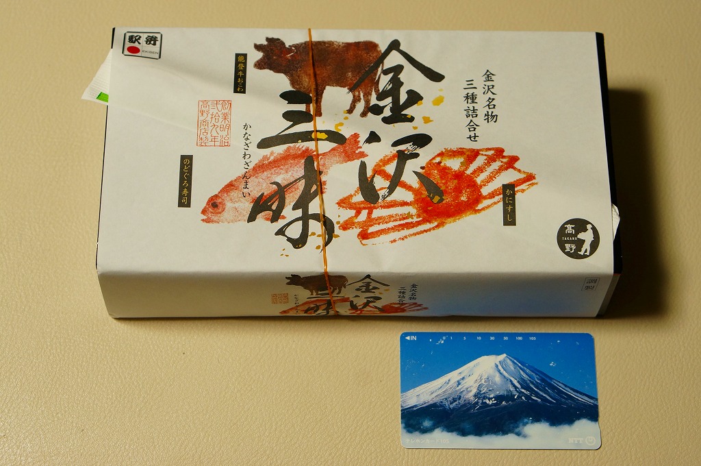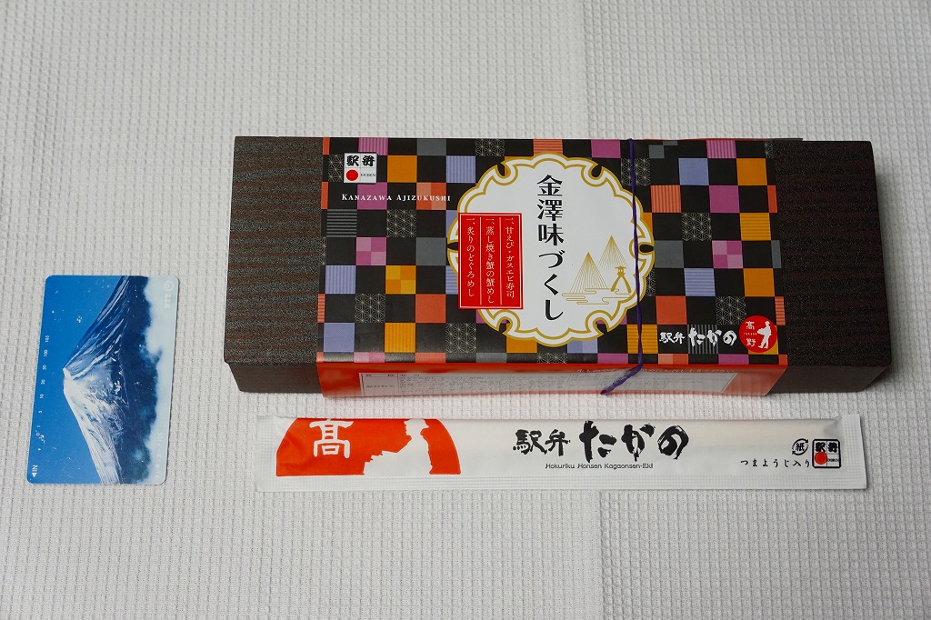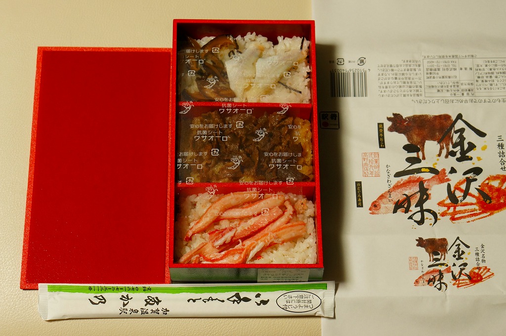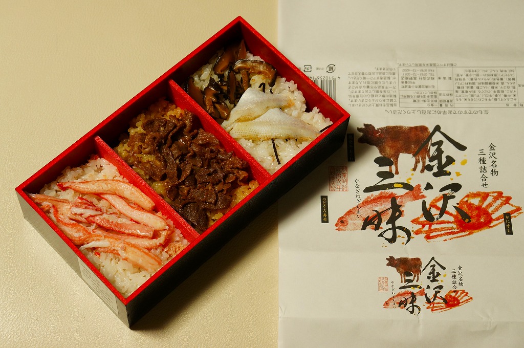 2015(平成27)年3月の北陸新幹線金沢開業に向けて、まずは同年1月の阪神百貨店の駅弁大会で実演販売。中身はかにすし、牛おこわ、のどぐろ寿司でシンプルな3区画の長方形ミニ丼の詰合せ。掛紙もシンプルに商品名と3種の食材の絵柄を描く。のどぐろの味わいがどこまで本格的か、経験が薄く分からないが、この組合せと詰合せはアリだと思う、分かりやすい見栄えと味。価格は2015年の発売時で1,200円、2023年時点で1,300円、11月時点で1,350円。