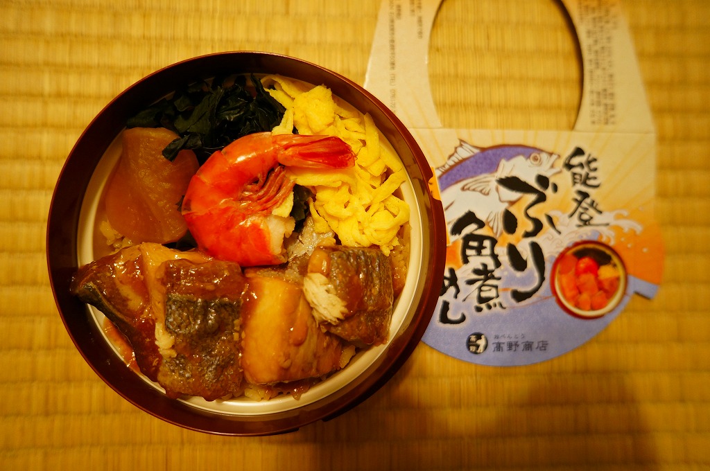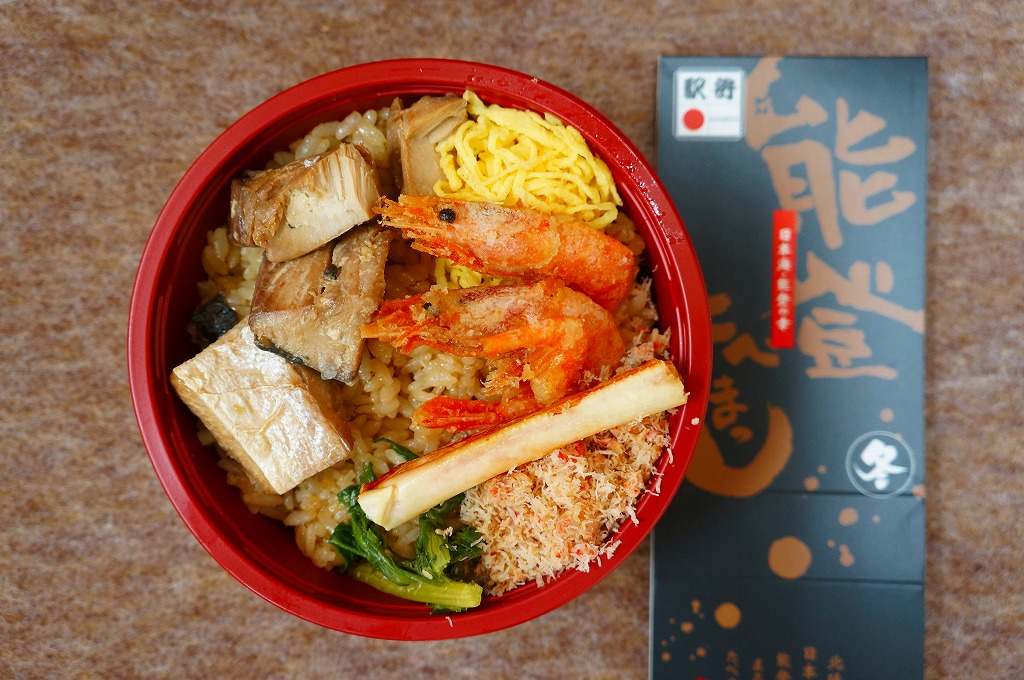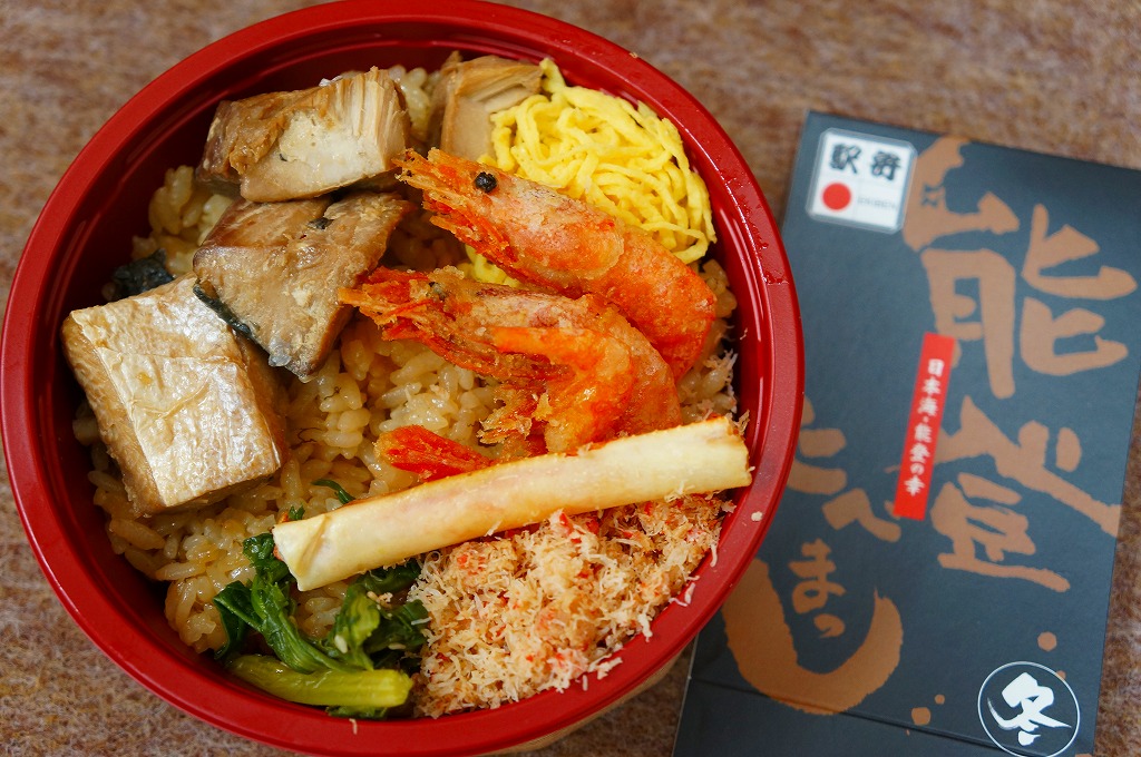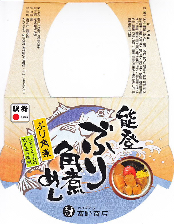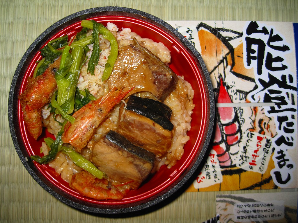 秋冬の駅弁大会シーズンに向けた、2011(平成23)年の秋に投入か。総プラスティック製の釜飯形の容器を、振りのイラストや中身の写真などを印刷したボール紙の枠にはめる。中身は茶飯の上をブリ角煮で半分、エビとエビと錦糸卵とワカメとダイコンで半分覆うもの。冷たくなった輸送駅弁なのに煮魚のうまみが生きている。この秋に一件あった加賀温泉駅弁に今シーズンの輸送で出会えたのも収穫だった。2013年までの販売か。