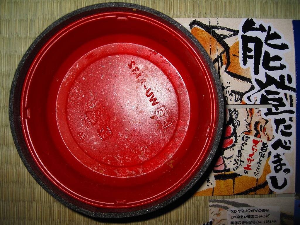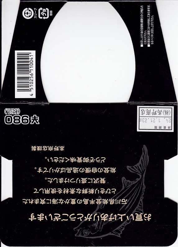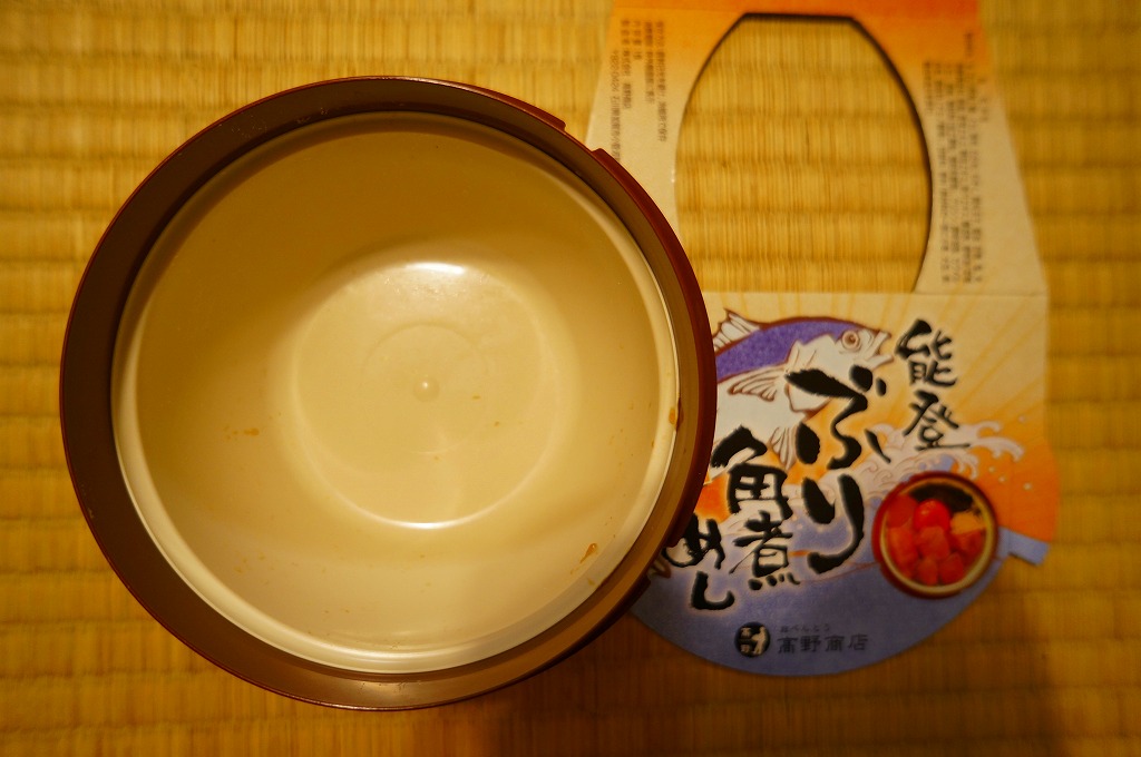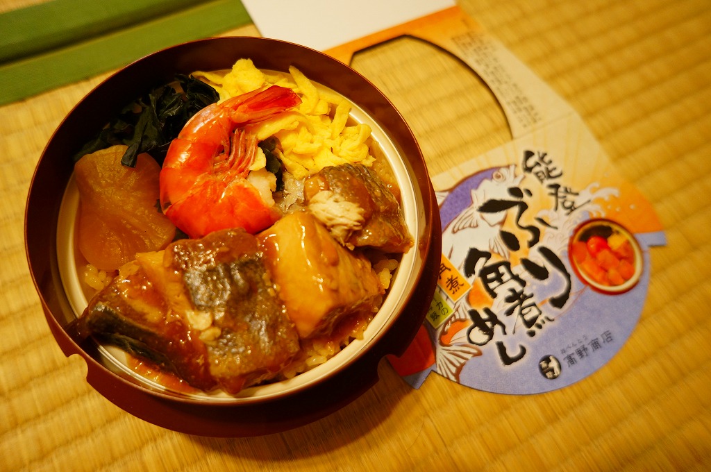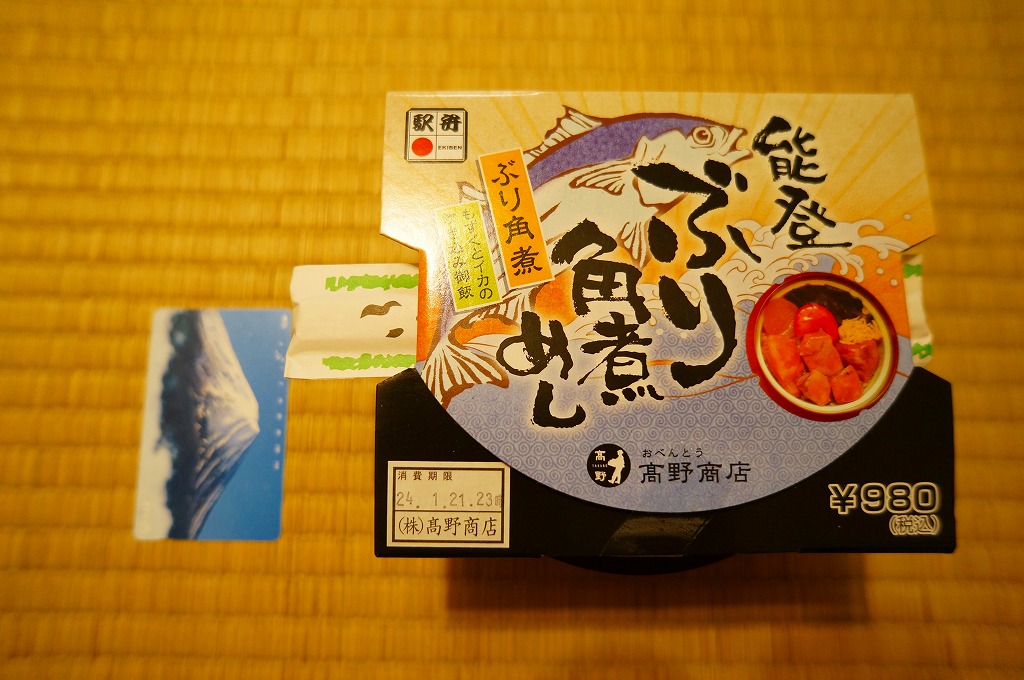 秋冬の駅弁大会シーズンに向けた、2011(平成23)年の秋に投入か。総プラスティック製の釜飯形の容器を、振りのイラストや中身の写真などを印刷したボール紙の枠にはめる。中身は茶飯の上をブリ角煮で半分、エビとエビと錦糸卵とワカメとダイコンで半分覆うもの。冷たくなった輸送駅弁なのに煮魚のうまみが生きている。この秋に一件あった加賀温泉駅弁に今シーズンの輸送で出会えたのも収穫だった。2013年までの販売か。
