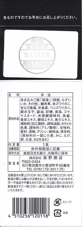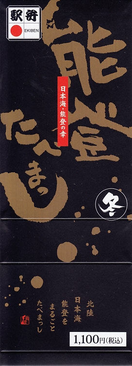 下記の駅弁「能登たべまっし」の冬バージョンだというが、どうもこれは2013(平成25)年1月の京王百貨店の駅弁大会でのみ売られたものである模様。通常版に比べて、紙箱が紙帯になり、中身にカニの脚とほぐし身が加わり、価格が120円アップ。見栄えがだいぶおとなしくなった気がしたが、味は引き続き良好。具も飯も軽く柔らかく良い感じ。