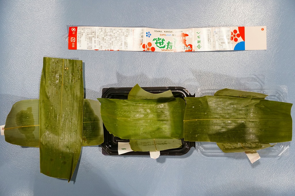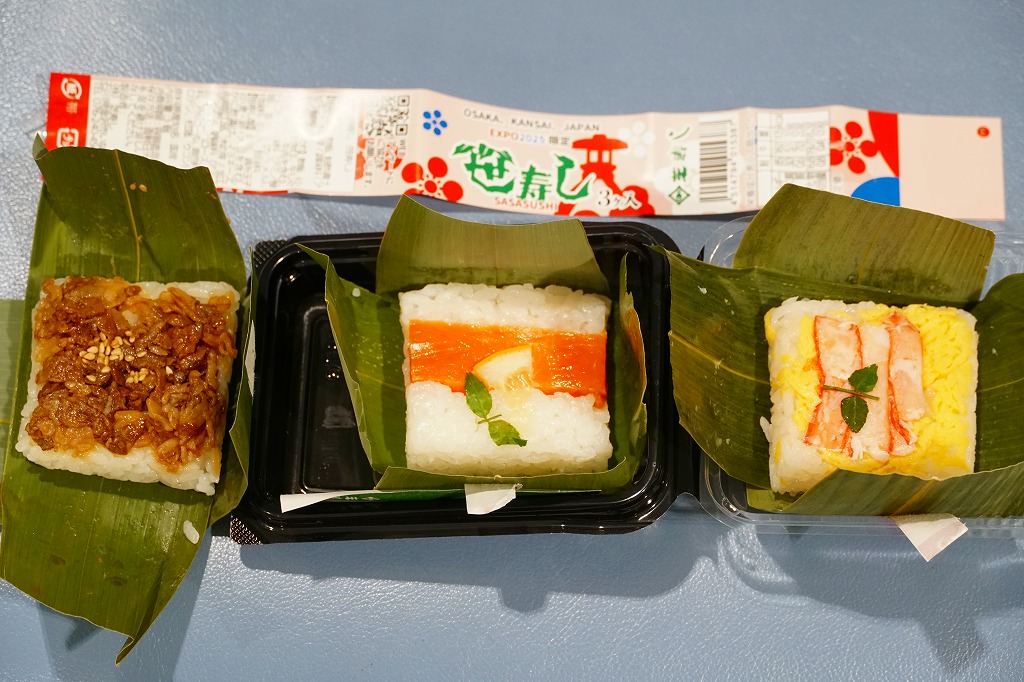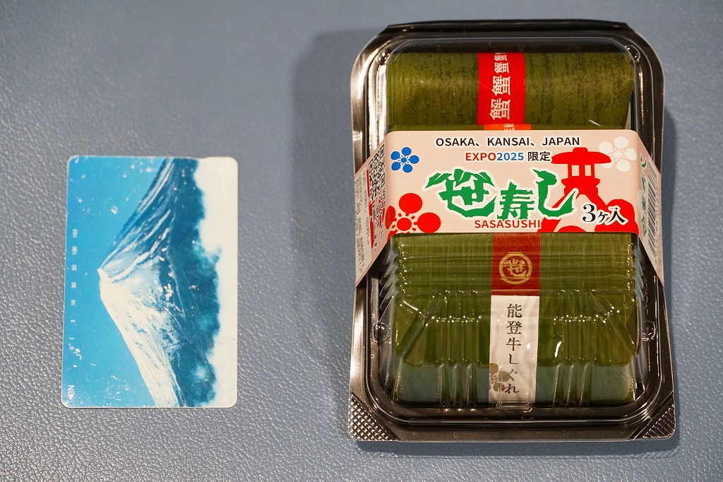 金沢で親しまれる芝寿しが、2025(令和7)年4月13日から10月13日まで開催される大阪・関西万博の土産物店「北陸お花ごっつおマルシェ」に出店、そこで買えた商品のひとつ。金沢の現地のものと同じ笹寿しを、能登牛しぐれ、鮭、紅ずわい蟹の3個セットでプラ容器に詰め、万博の名を記した紙帯を締めたもの。価格は現地の5割増という感じでも、万博会場内なのできっと気にされない。