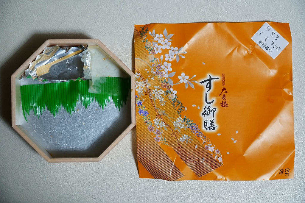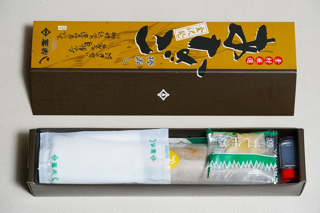 長持を模した紙箱の中に、ふた付きのトレーを入れる。中身は、あと少し押せば煎餅になりそうなほど固く締まった古代酢使用の酢飯の上に、紅鮭と小鯛で紅白をあしらった身を乗せる押し寿司。レモンの小片が添えられる。春秋の祭礼の際に御馳走として作られるという、加賀の伝統料理だそうな。価格は2002年の購入時で600円、2015年時点では650円。2015年頃までの販売か。