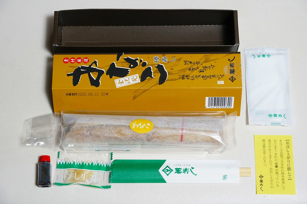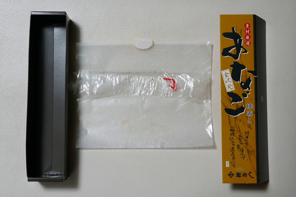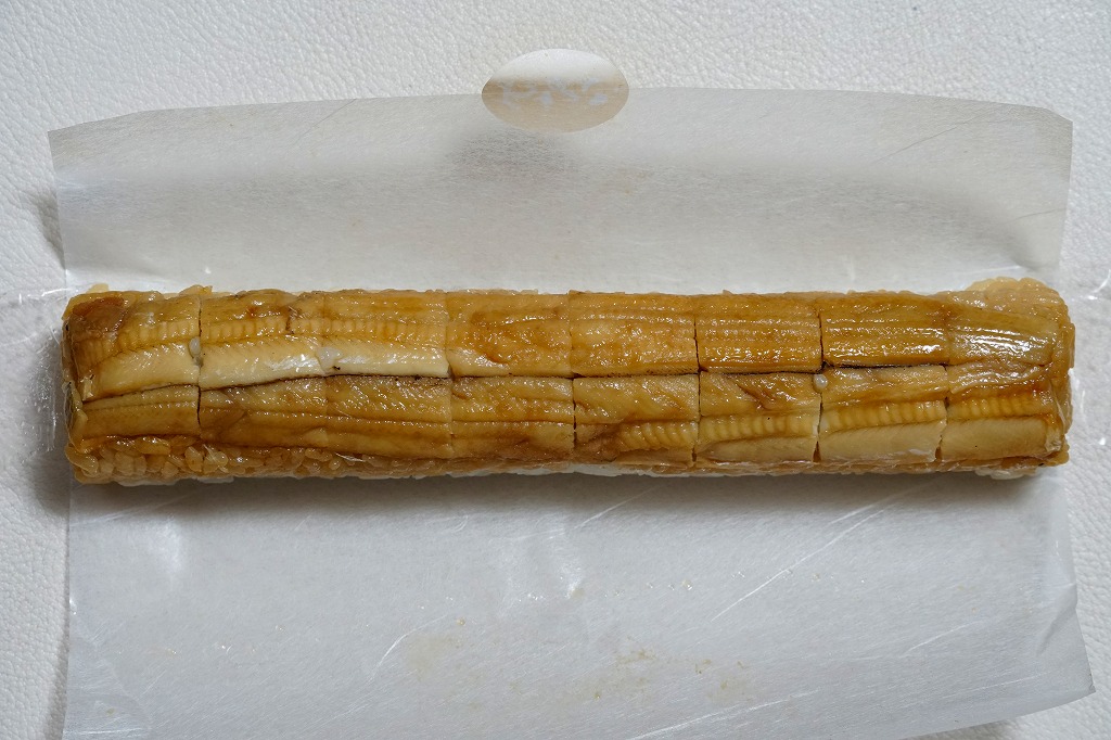 酢飯の半分にタレを染み込ませて、煮穴子を貼り付けた棒寿司を1本、縦横にフィルムで巻いて袋に密封し、たれと生姜と割りばしとおしぼりを含めて紙箱に詰めて、スリーブに収める。味は柔らかくも普通の穴子寿司。細長いにも程があると思う、市販の太めの魚肉ソーセージをもう少し太くしたくらいの、スリムな形状が印象的。
