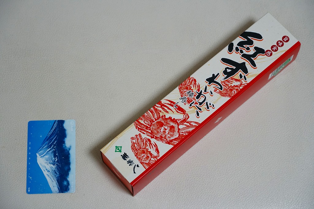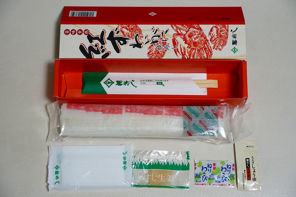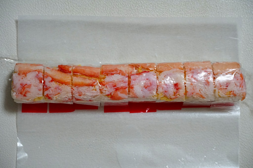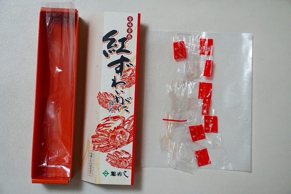 焼海苔を挟んだ酢飯に、ベニズワイガニの棒肉やほぐし身と錦糸卵を貼り付けた棒寿司を1本、フィルムで巻いて8切れにカットして、さらにフィルムで巻いて袋に密封し、醤油とわさびと生姜と割りばしとおしぼりを含めて紙箱に詰めて、スリーブに収める。マヨネーズを隠し味とする、見た目も味も今風のカニ棒寿司。細長いにも程があると思う、市販の太めの魚肉ソーセージをもう少し太くしたくらいの、スリムな形状が印象的。