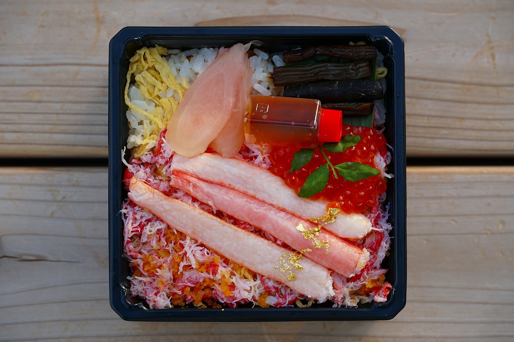 有名駅弁に多用されるボール紙の立体パッケージの中に、密封されたトレーが入る。中身は固く締まった酢飯の上に細かいカニ身と牛そぼろが載るもの。お箸でそのまま食べられるが、プラのナイフも添付する。