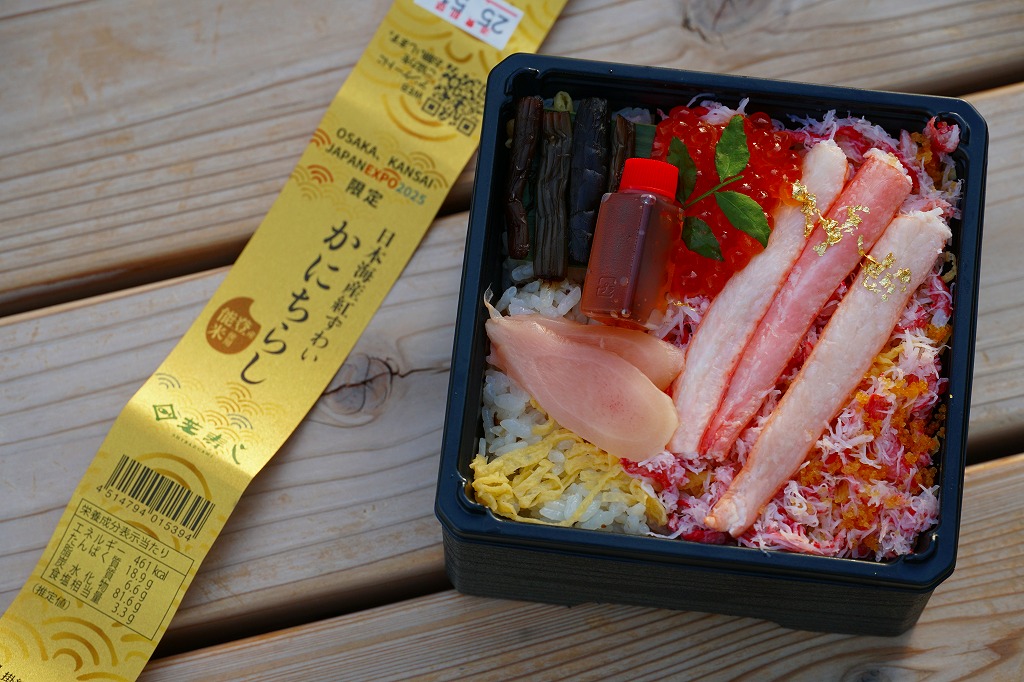 金沢で親しまれる芝寿しが、2025(令和7)年4月13日から10月13日まで開催される大阪・関西万博の土産物店「北陸お花ごっつおマルシェ」に出店、そこで買えた商品のひとつ。金沢でも人気というかにちらしに、正方形のプラ容器に五目酢飯を詰めてカニのほぐし身と棒肉ととびこで覆ったものにいくら、生姜酢漬け、ふき佃煮、錦糸卵を添えたものに、金粉を振り、万博の名を記した金色の紙帯を締めたもの。とても高額な商品だが、万博会場内なのできっと気にされない。