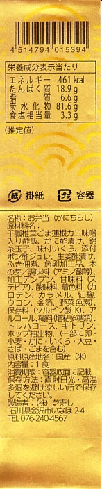 金沢駅の駅弁は、同じ北陸本線の富山・加賀温泉・福井・敦賀の各駅の駅弁にに押されてか、どうか知名度が薄いと思う。しかし加賀藩政以来の伝統のなせる技か、とても繊細で芸術的な駅弁を創り出していると感じる。この駅弁もシンプルながら粒のひとつひとつにまで美しさが感じられるような、見た目も味も繊細な仕上がりが、もっと注目されてもいいと思う。2005年頃までの販売か。