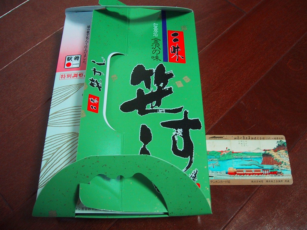 2004(平成16)年7月26日に購入した、金沢駅弁のパッケージ。当時のJR西日本の駅弁キャンペーン「駅弁の達人」のシールが貼られる以外は、容器も中身も価格も、上記の2003年のものと同じ。