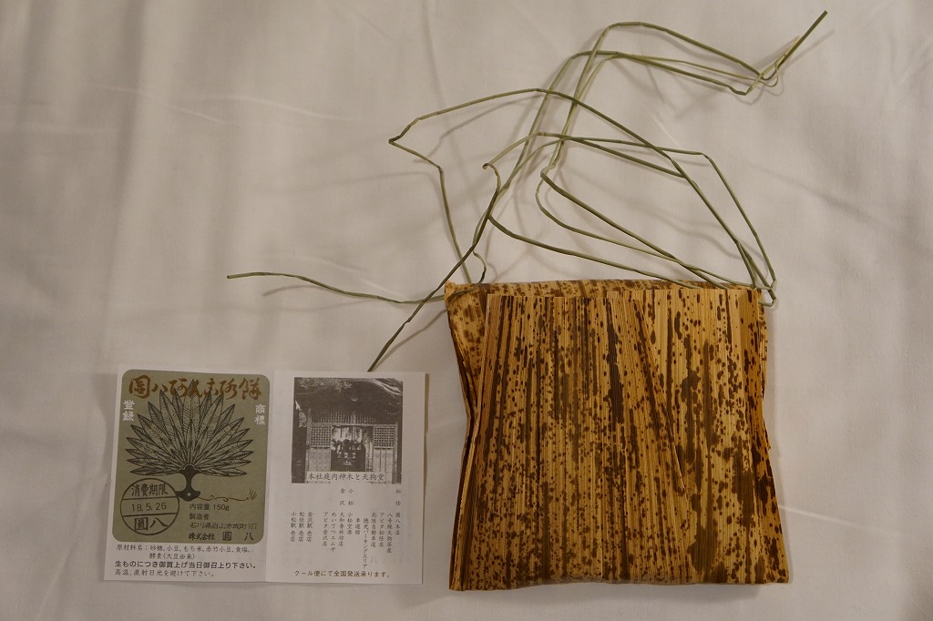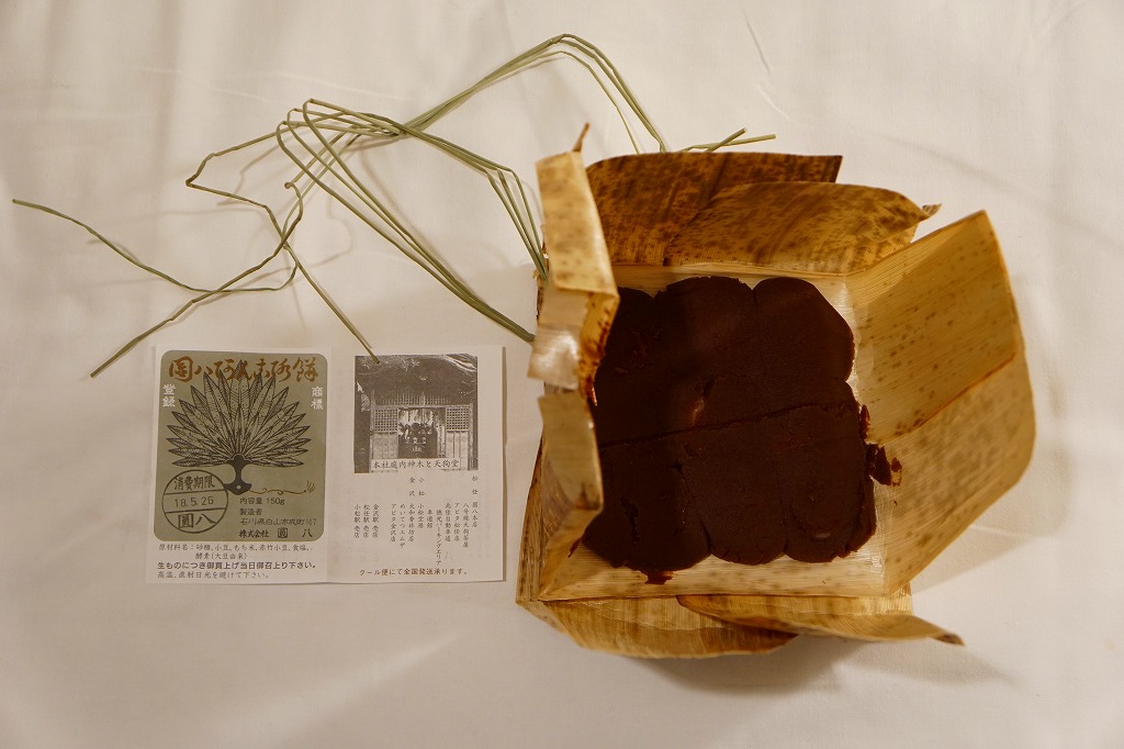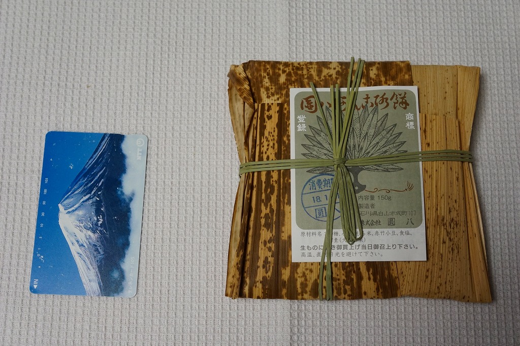 江戸時代の元文2年(1737年)に調製元が創業し発売、1898(明治31)年の松任駅開業と同時に駅での立ち売りを始めたという、地元の銘菓かつ鉄道銘菓。餅米の白い団子をこしあんで包んだあんころもちが9個、竹皮2枚で十字に包まれ、掛紙をのせてひもで十字にしばられる。竹皮の中身はぺったんこで、こしあんの板から9粒の餅球が出現。風味はざらざら。これが創業380年、駅売り120年の味。価格は2017年時点で370円、2018年の購入時で390円、2020年時点で420円、2023年時点で450円、2024年時点で480円。