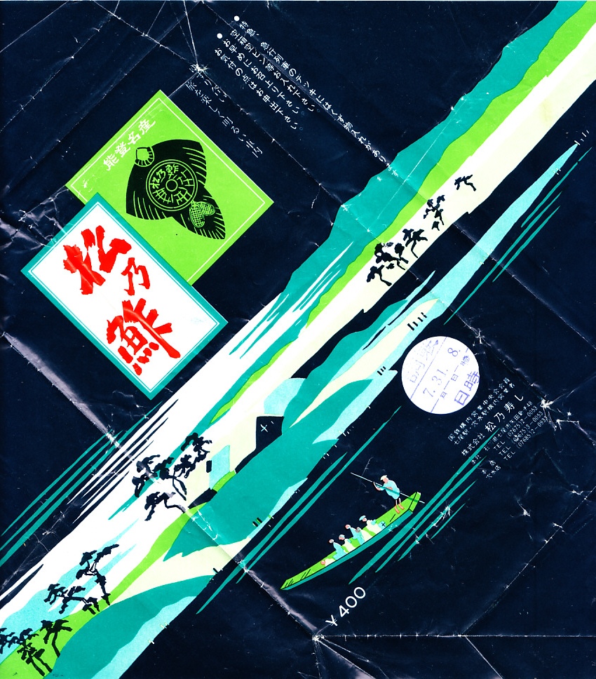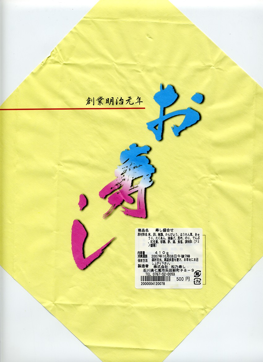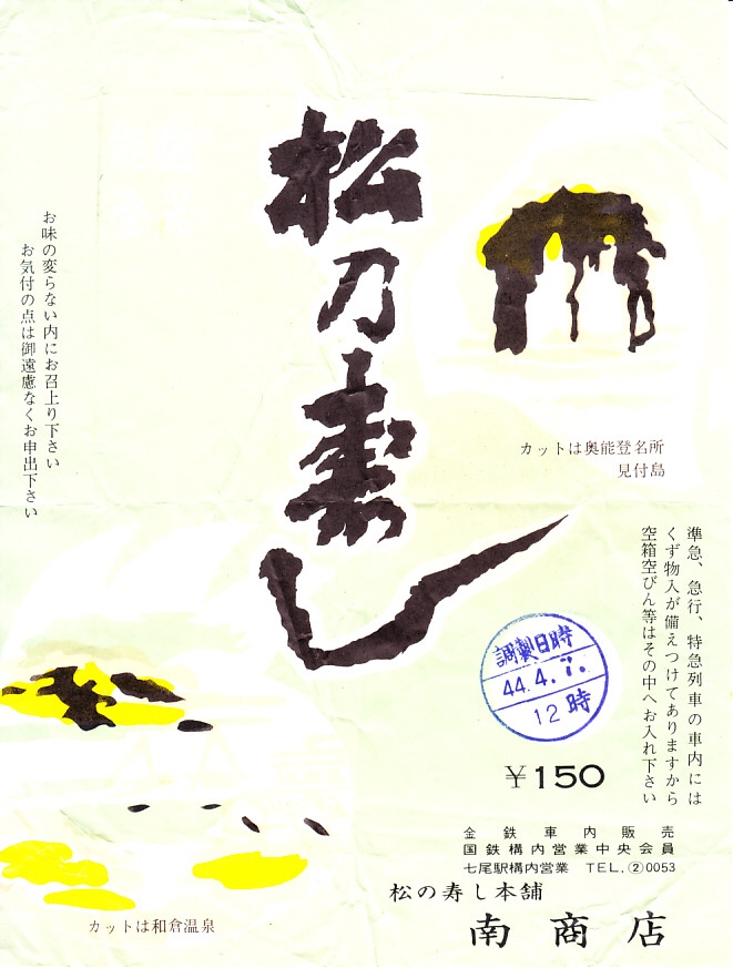 1969(昭和44)年4月7日の調製と思われる、昔の七尾駅弁の掛紙。見付島と和倉温泉を描いたとするが、そうはみえない抽象画。調製元は昭和30年代に「松の寿し」を、昭和40年代にこの「南商店」を、昭和50年代から「松乃寿し」を名乗ったか。