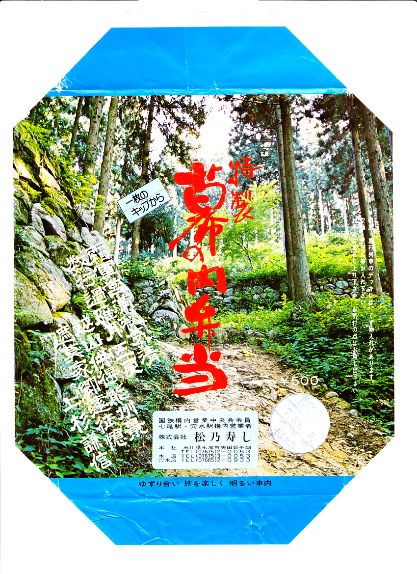 1980年代、昭和60年前後の、4月29日8時の調製と思われる、昔の七尾駅弁の掛紙。絵柄は上記の2007年10月購入のものと同じで、内容もだいたい同じだろう。幕の内タイプの駅弁でありながら、おかずに能登の海の物を多く取り入れた、当時では比較的高価な駅弁だった。