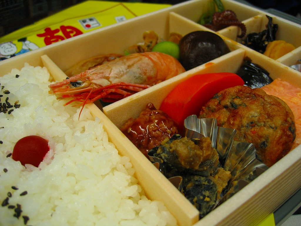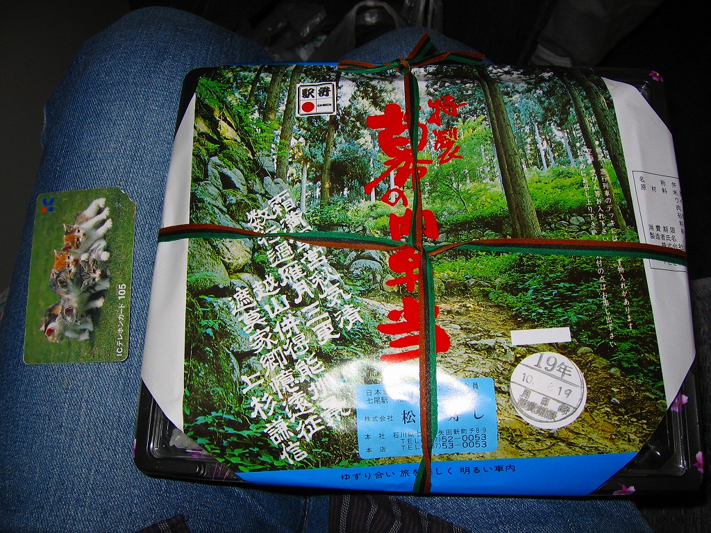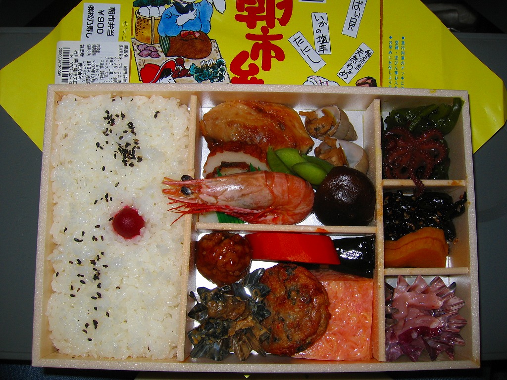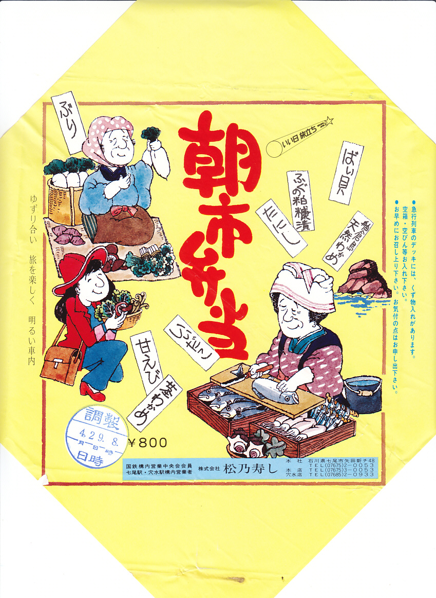 七尾駅の上等幕の内駅弁で、昭和時代の名物駅弁。強度が足りない容器に、能登の朝市を昭和風に描いた掛紙をかける。中身は日の丸御飯に海老、焼き魚、タニシ2個、イカ塩辛、ばい貝、イイダコ、ひじき、肉団子、昆布巻き、枝豆、カマボコ、薩摩揚など多種多様で港町を少々感じるおかずを添えるもの。