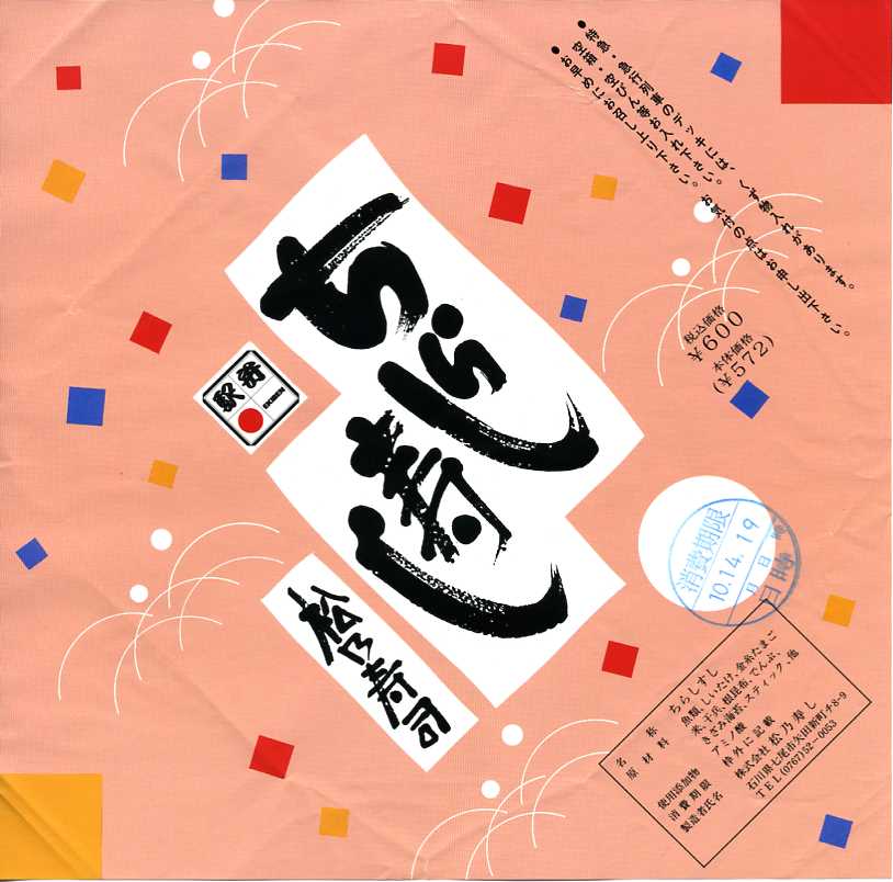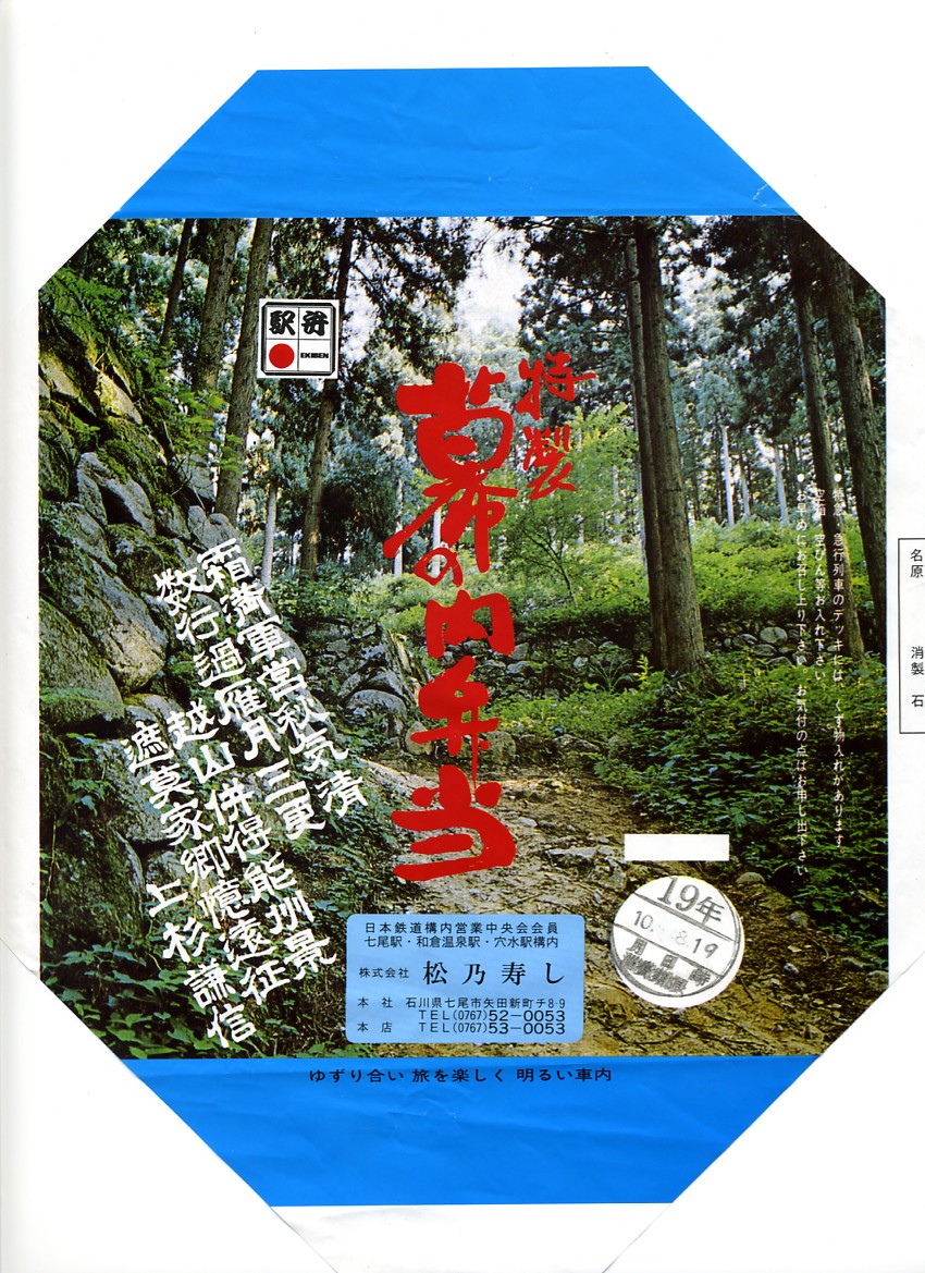 2000(平成12)年10月14日19時の調製と思われる、昔の七尾駅弁の掛紙。能登旅行で購入したはずが、中身はおろか、いつどこで買ったかも覚えていないため、当時の旅程から推測した。