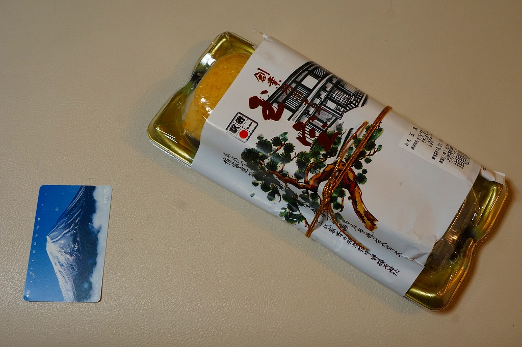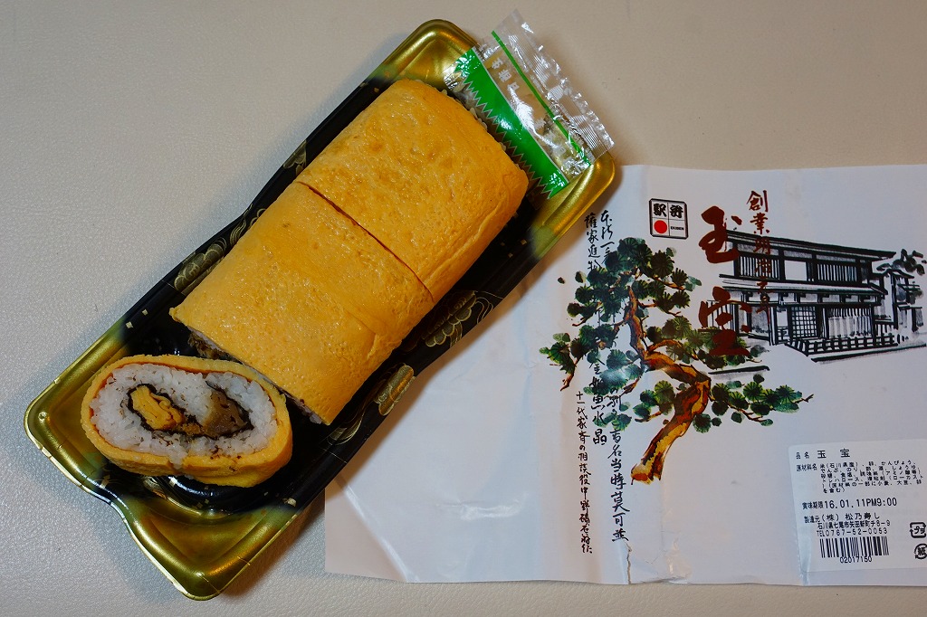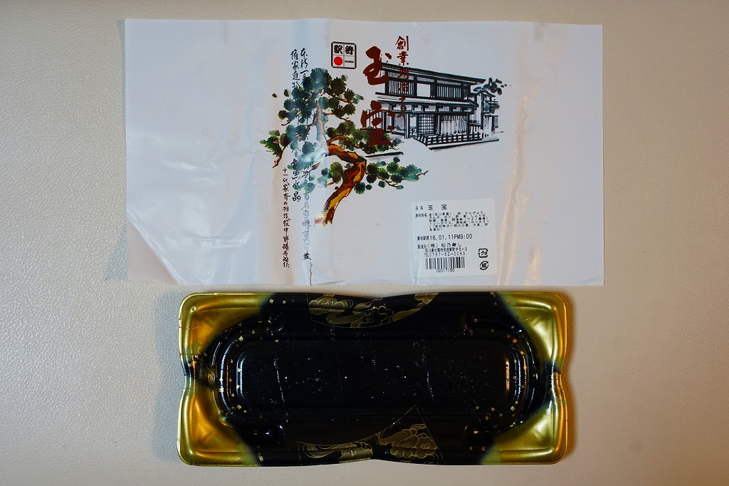 七尾で評判の駅弁「玉宝」の、大きいほう。これは2016(平成28)年1月の京王百貨店の駅弁大会で購入したが、七尾駅の駅弁が駅弁大会へ出てくることはおろか、能登半島でないところで売られるのを初めて見た。スーパーでもおなじみの寿司向け惣菜トレーに、カンピョウとでんぶと玉子焼を酢飯と玉子焼で巻く、歴史と伝統の玉子巻を1本据える。デパートの開店後10分から30分で売り切れる人気だった。