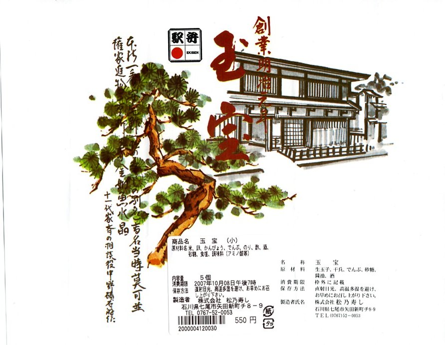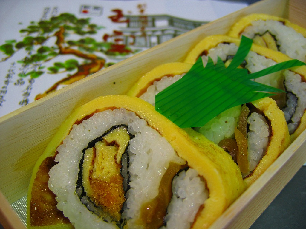 七尾で評判の駅弁。明治元年(1868年)から五代140年の歴史がある寿司屋が将軍にも献上したという、玉子焼の巻き寿司が入る。甘く柔らかい玉子太巻は、視覚でも味覚でも雅な風味を出す。写真の5個入りは550円、同じ掛紙を使う7個入りは800円。本店の寿司屋では玉子巻の名で8個1,000円にて提供され、一日300個前後を作るそうな。2014年4月の消費税率改定で、5個入りは565円。