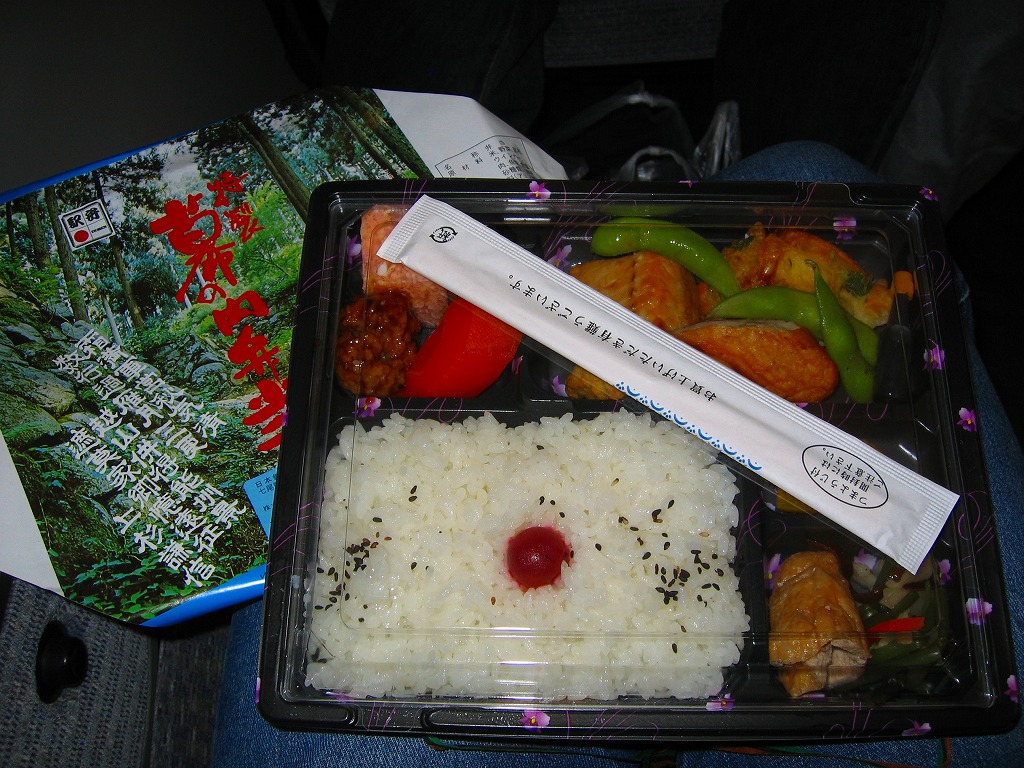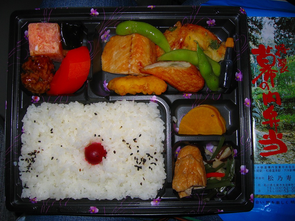 七尾駅の幕の内駅弁。プラ製の浅い惣菜容器を、森の写真を載せた大きな掛紙で包む。中身は日の丸御飯に焼き魚や肉団子、薩摩揚にチキンナゲットに枝豆、山菜に昆布巻にデザートのゼリー状の立方体は何だろう、この価格にしては分量も風味もなかなか。市販品だと思うがプラ製の惣菜容器のプリントと質感と構造には高級感もあり、風味への貢献は簡素な経木枠の容器より良いかもしれない。名物にはならないが、仕事をしている駅弁。