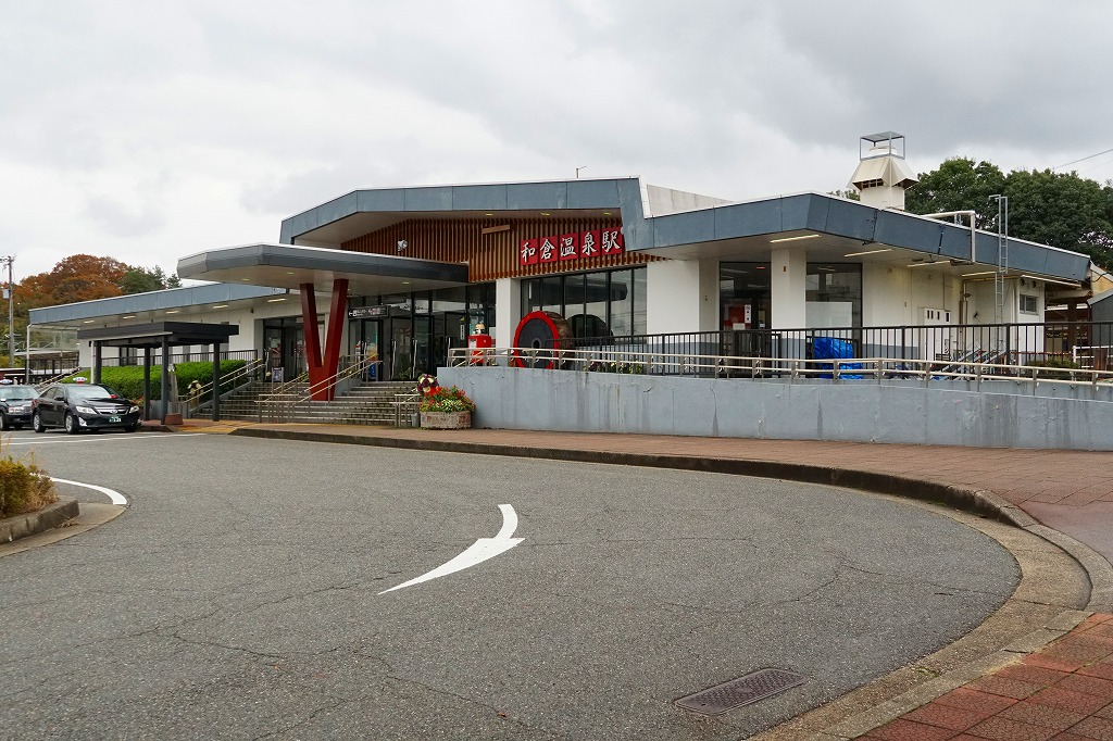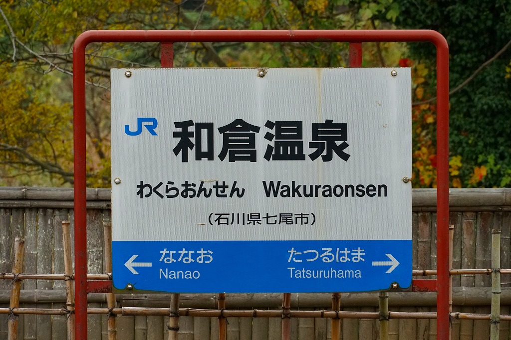 七尾駅の隣の駅。その名のとおり和倉温泉の最寄り駅で、1980年には駅名を和倉から変えて、温泉街までバスで5分。七尾駅の駅弁が駅待合室のキヨスクで売られたが、2016年の閉店までに終売。1925(大正14)年12月15日開業、石川県七尾市石崎町タ。
