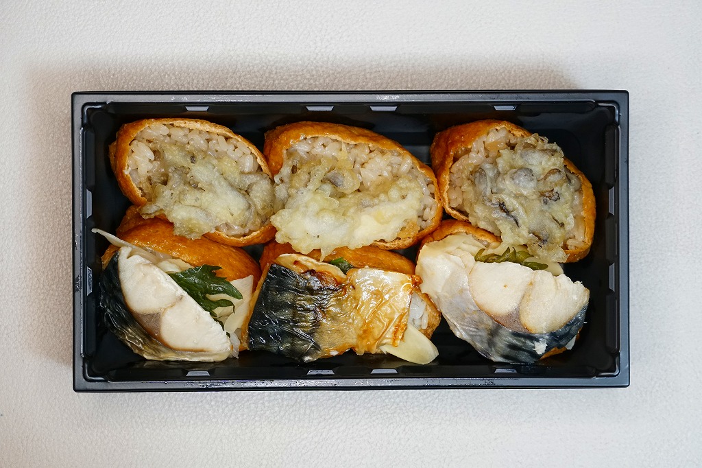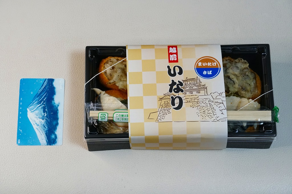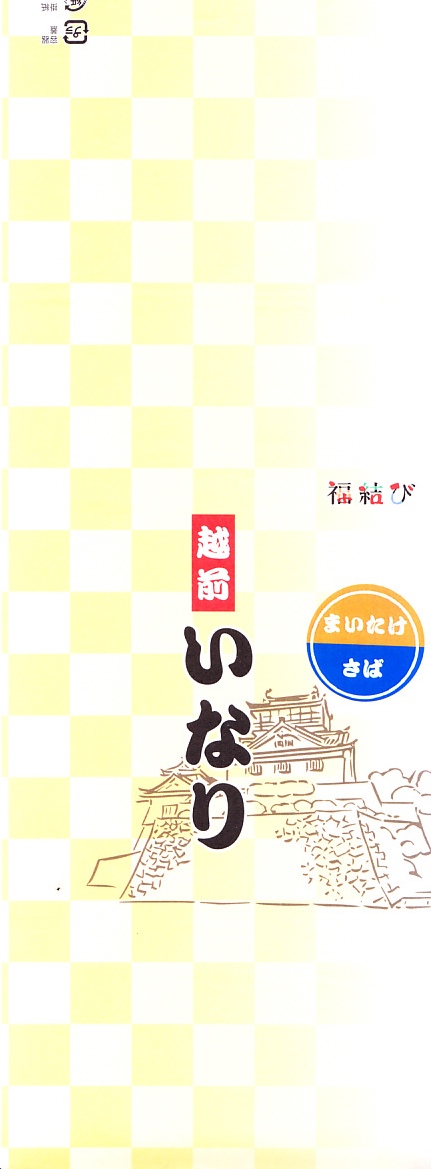 2024(令和6)年1月の京王百貨店の駅弁大会で、九頭竜湖駅の駅弁として実演販売。商品名は催事の一覧表では「まいたけ稲荷・焼きサバ稲荷」であった。「福結び」「まいたけ さば」「越前いなり」の文字と越前大野城を描いた掛紙を巻く惣菜向けプラ容器に、舞茸御飯を詰めてマイタケ天を載せたおいなりさんを3個と、酢飯に焼サバとしその葉とガリを載せたおいなりさんを3個詰める。福井の山の幸と海の幸の詰合せと解釈することもできそうな、ユニークな具のおいなりさん。こんな商品が現地の駅か道の駅に、あるのかどうか。
