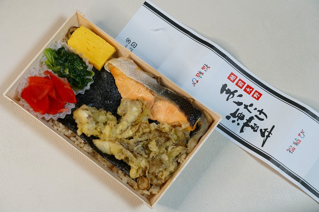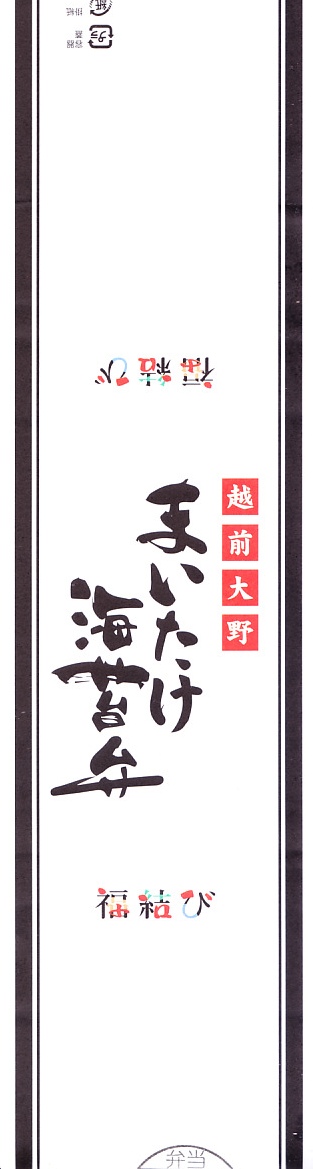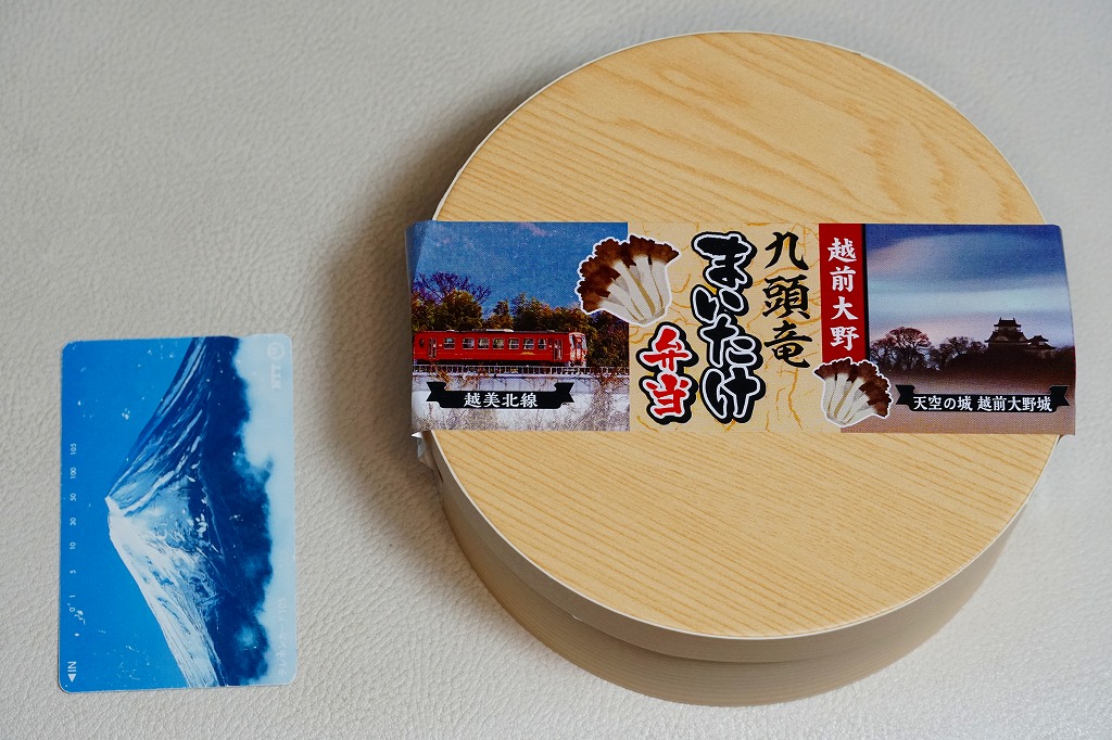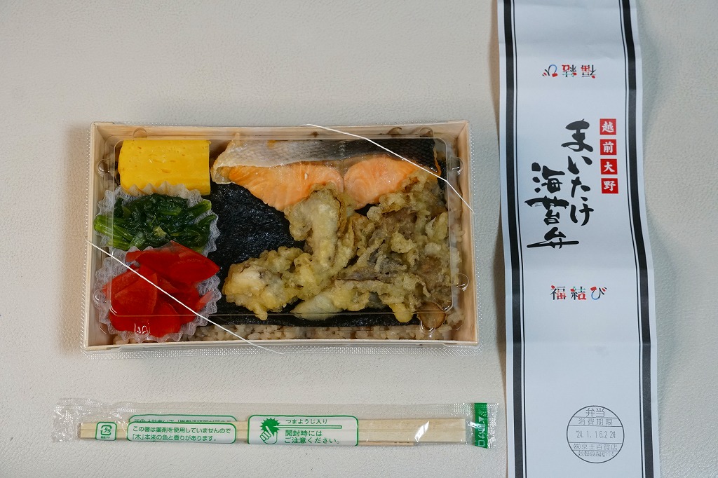 2024(令和6)年1月の京王百貨店の駅弁大会で、九頭竜湖駅の駅弁として実演販売。商品名は催事の一覧表では「九頭竜まいたけ海苔弁」であった。「福結び」「越前大野」「まいたけ海苔弁」の文字を描いた紙帯を巻く長方形の容器に、舞茸御飯を敷き、海苔で覆い、マイタケ天と焼鮭を載せ、玉子焼とネギと福神漬を添える。もし仮にこの弁当が本当に九頭竜の道の駅で存在すれば、700円くらいで買えると思う簡素なお弁当。現地で売られる舞茸弁当は、大野市街の土産物店にも入荷し、500円前後で買える。