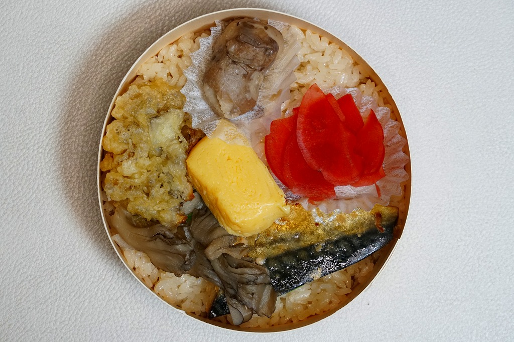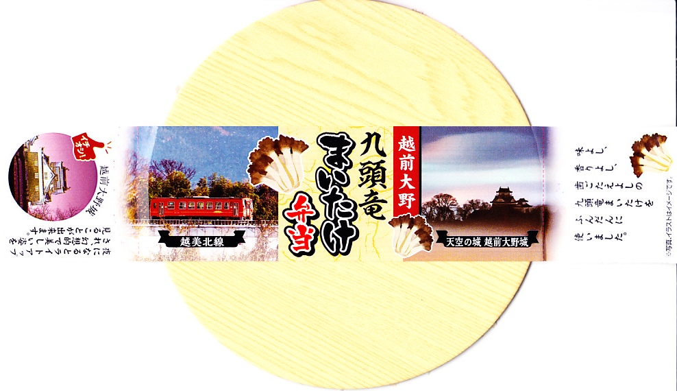 2023(令和5)年1月の京王百貨店の駅弁大会で実演販売。福井県のJR越美北線の九頭竜湖駅で、冬期間(11月中旬から3月まで)予約販売される駅弁を名乗り販売。実際には京王百貨店の駅弁大会の担当者が、福井県大野市で九頭竜湖駅に隣接する「道の駅九頭竜」で買えた舞茸弁当、マイタケの炊き込みごはんを、催事の商品に仕立てたもの。2012年や2014年にも、そんな触れ込みで売られた「駅弁」を、この催事場で見た気がする。