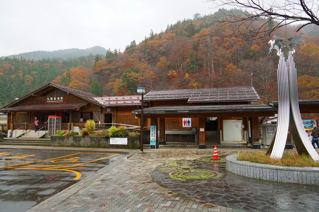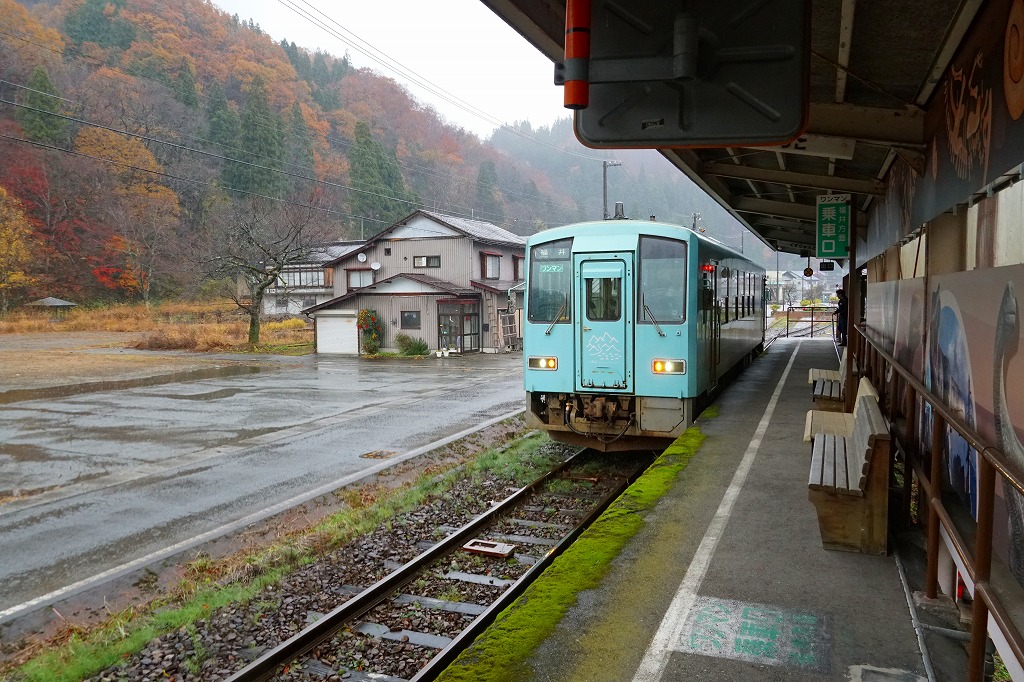 福井駅からJR越美北線(えつみほくせん)の列車で約100分。越前と美濃を、福井と岐阜県美濃太田を結ぶ鉄道の一部として1972年に開業したが、以後に路線が延伸することなく終着駅となった。百貨店の駅弁催事によると、駅弁が2023年1月に誕生したことになっている。1972(昭和47)年12月15日開業、福井県大野市朝日。